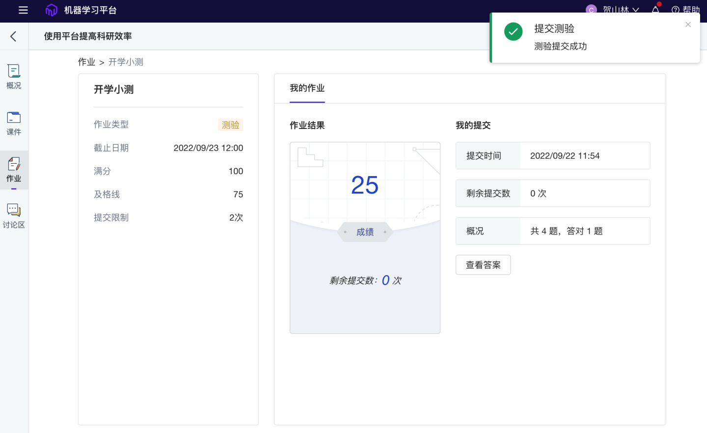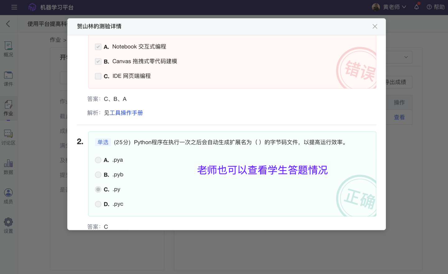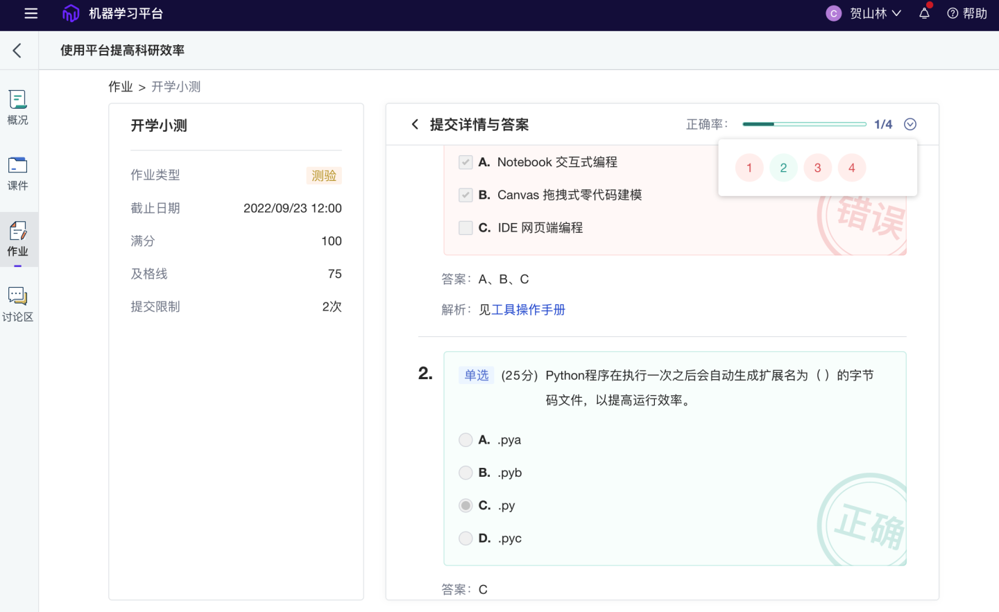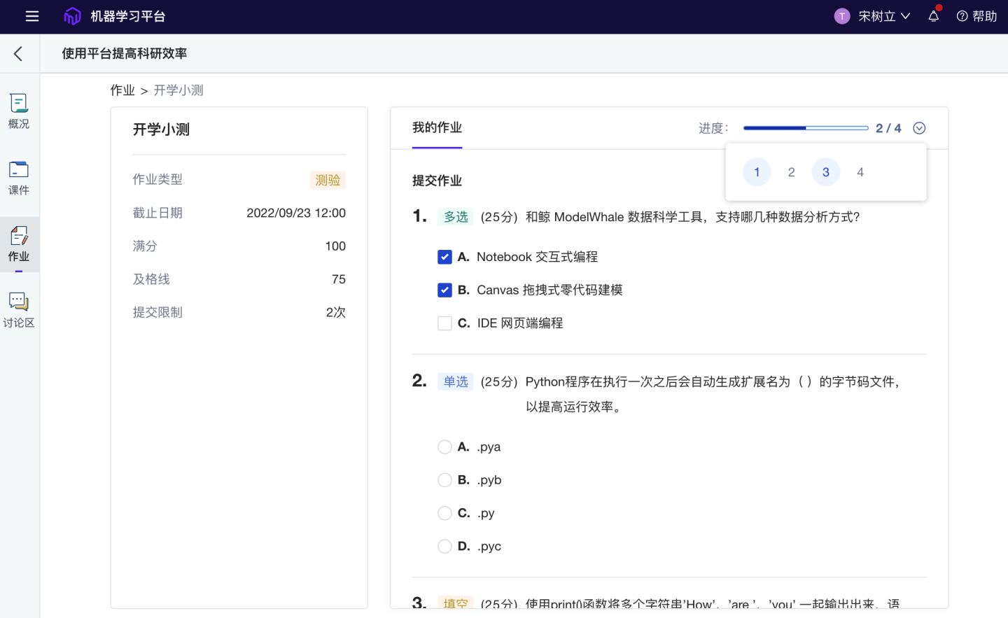 老师们可以在 ModelWhale 教学实训平台进行课程教授、作业评估、成绩汇总、问题讨论等操作,作业类型支持试卷测验、自动评估、主观评估。学生进行试卷测验时,现可以利用右上角的进度条了解自身作答进度。查看答案时,学生可以比对“自身答案”与“正确答案”的区别,也可以利用进度条快速定位错题。更多详见教学实训手册。