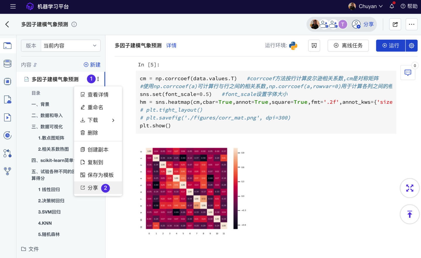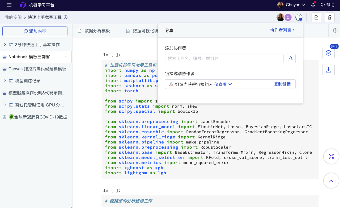 用户现除了可以分享整个项目外,还可以选中项目内的某个 Notebook 进行分享。其他人点击“分享链接”即可查看浏览该 Notebook。单个 Canvas 也支持通过上述方式进行分享。