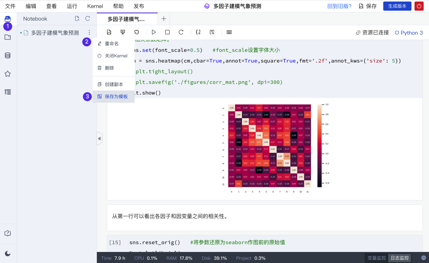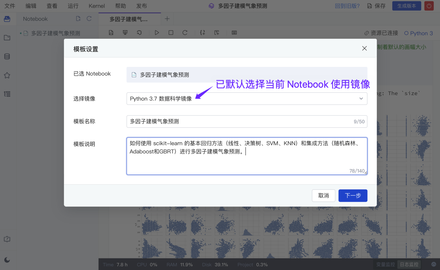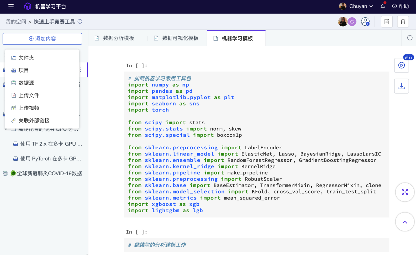 管理员可以将团队内常用的建模流程、分析流程等保存为「Notebook 模板」、「Canvas 模板」,供他人便捷复用。保存模板时,我们已自动关联当前依赖环境、数据,提高模板可复现性,管理员也可以进行调整。官方及团队分享的「Notebook 模板」、「Canvas 模板」都可以在【启动页】内被大家调取使用。