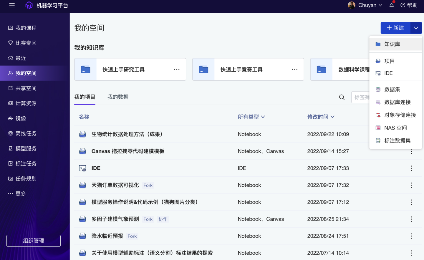 我的文件夹(知识库)正式和大家见面了。用户现除了可以使用“标签”进行文件管理外,还可以使用文件夹(知识库)对项目、数据、文件、视频等进行整理沉淀。知识库内支持预览 Notebook、Canvas、数据等文件,也可以进行代码运行、文件下载等操作。团队版用户还可以将个人知识库分享给组织内的其他成员,共同管理知识库(分享后该知识库将在「共享空间」内出现)。