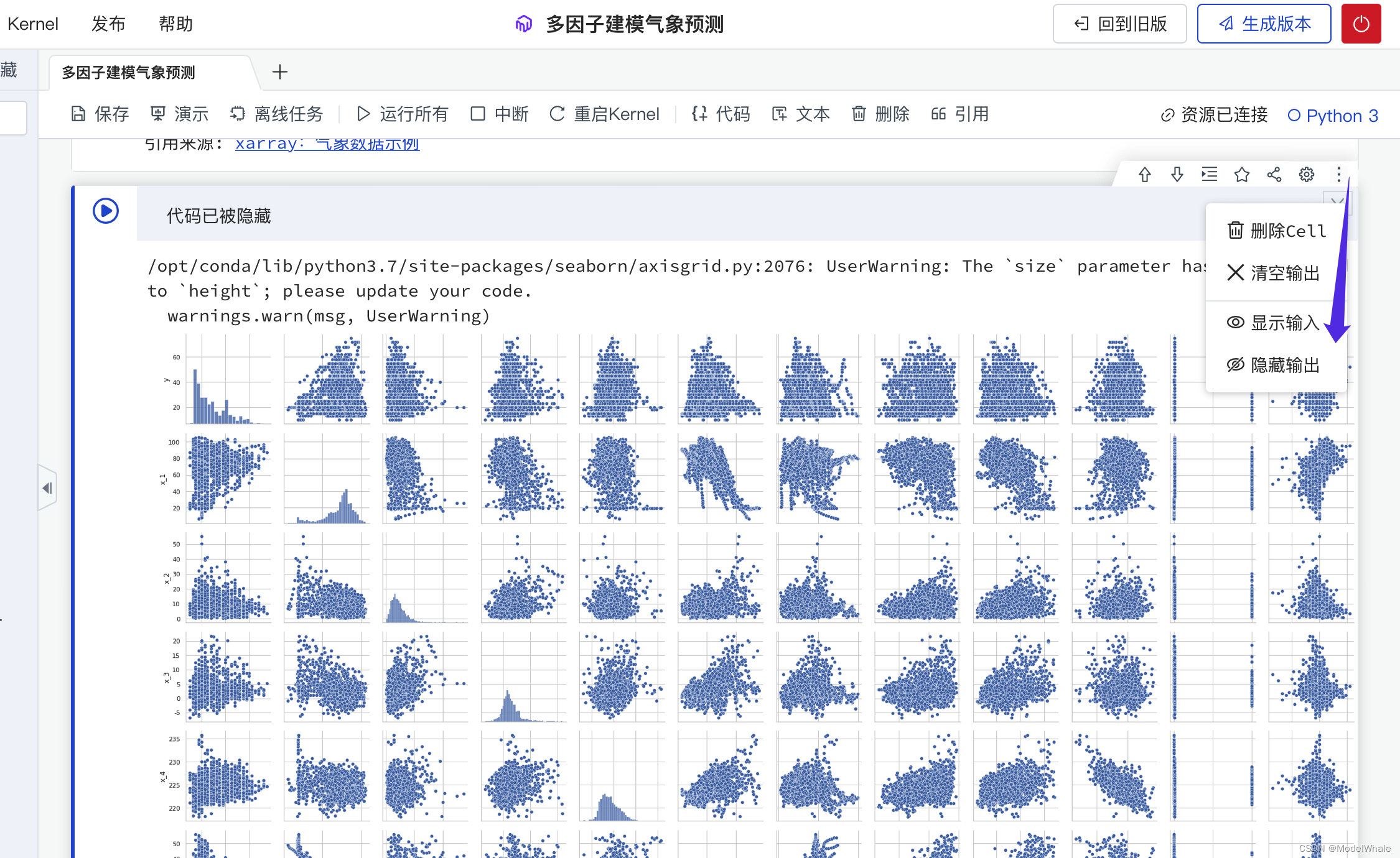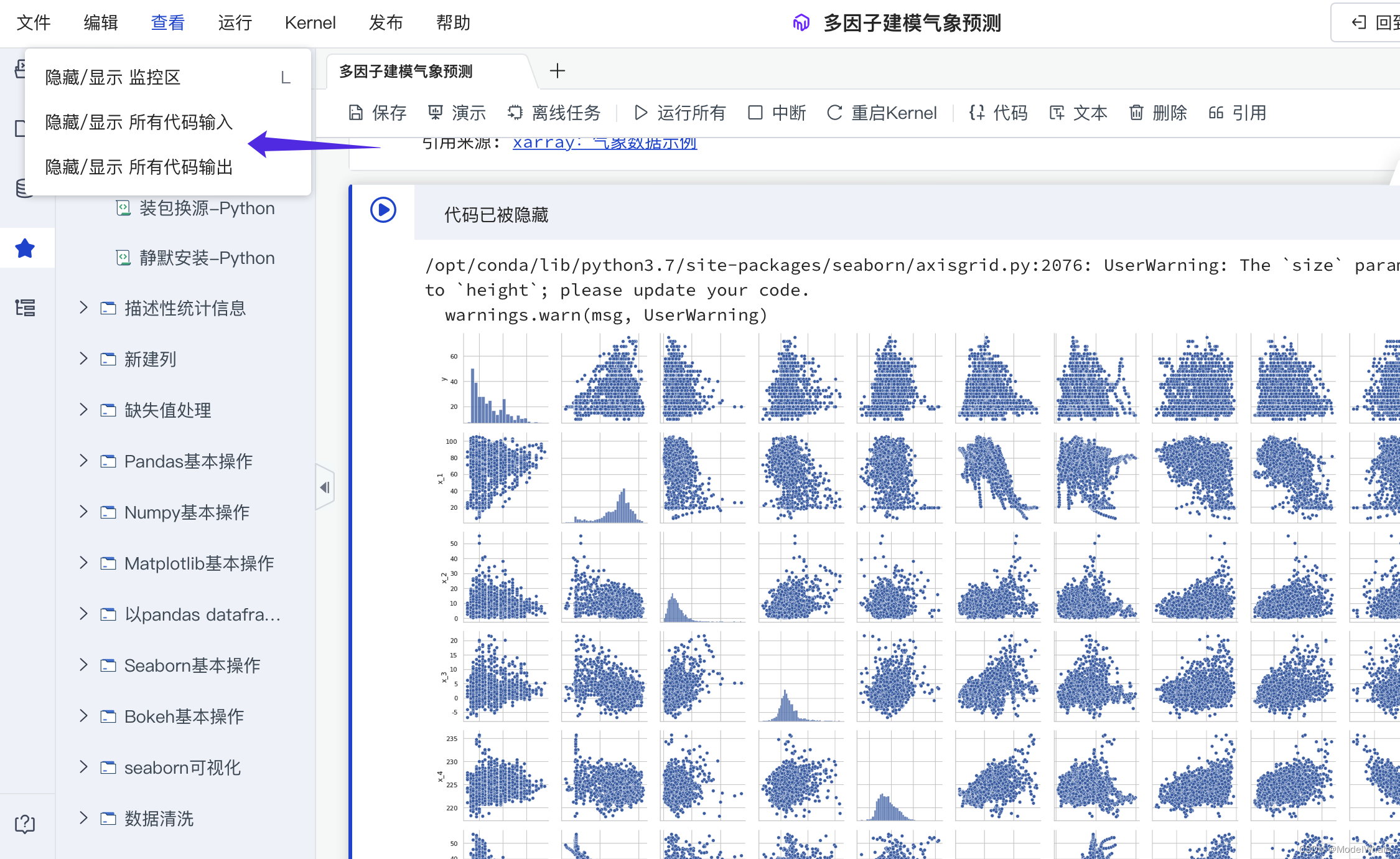 Notebook 具有较好的代码展示性,可用作“项目报告”承载研究成果。我们对代码的输入/输出展示进行了相关优化,让你更便捷地隐藏单个 Cell 的输入/输出,也支持批量隐藏,为你简洁的报告书写助一臂之力。