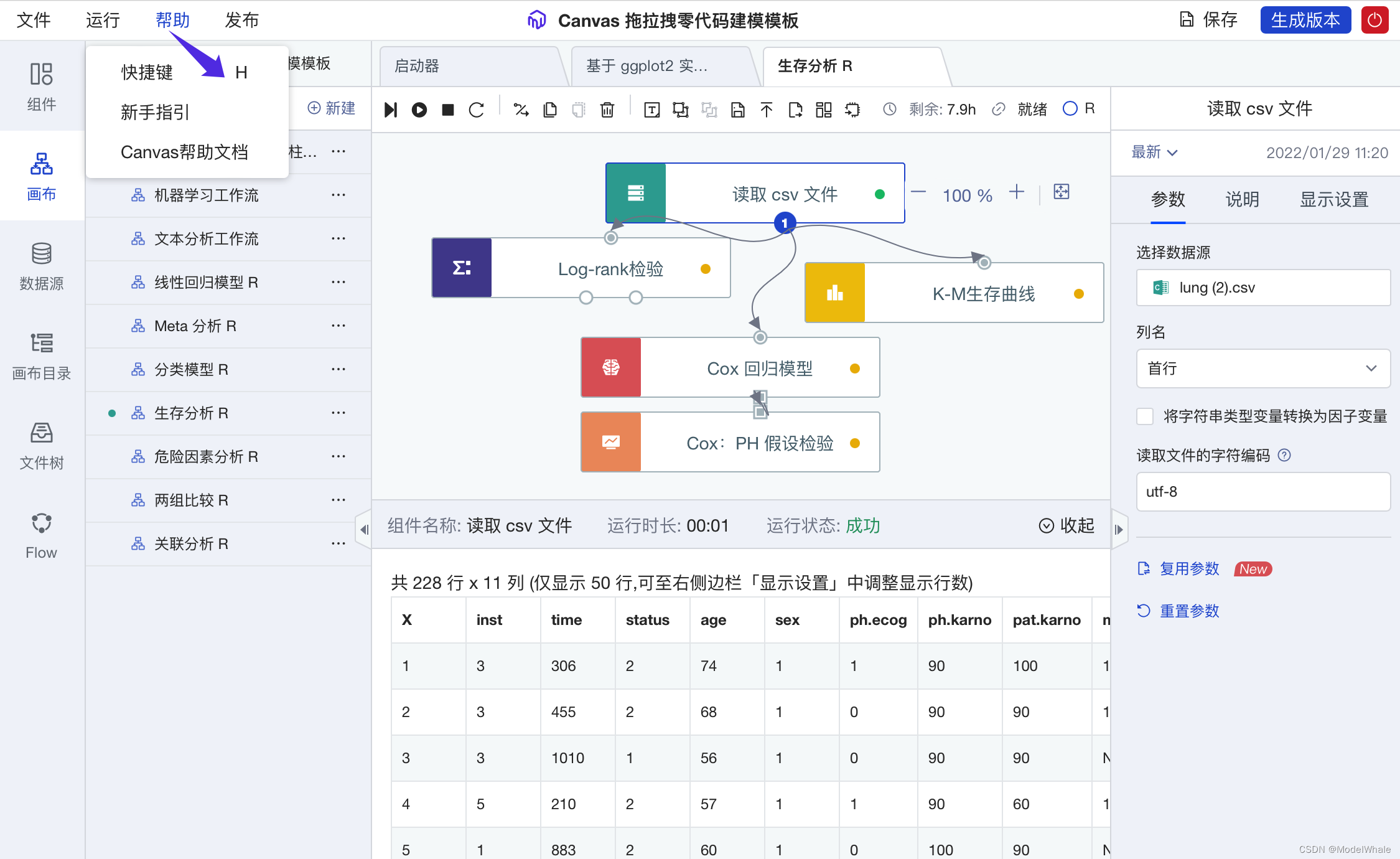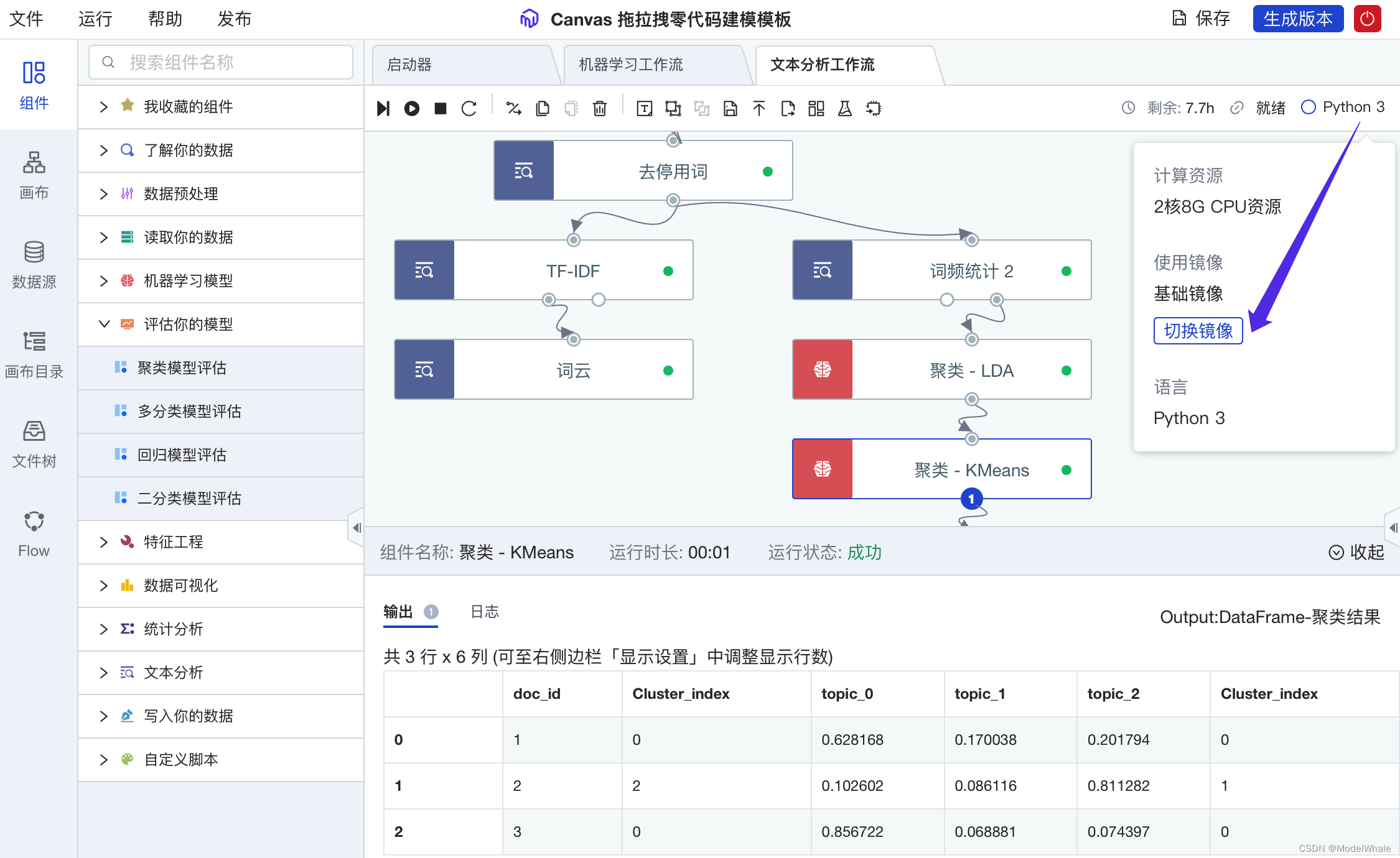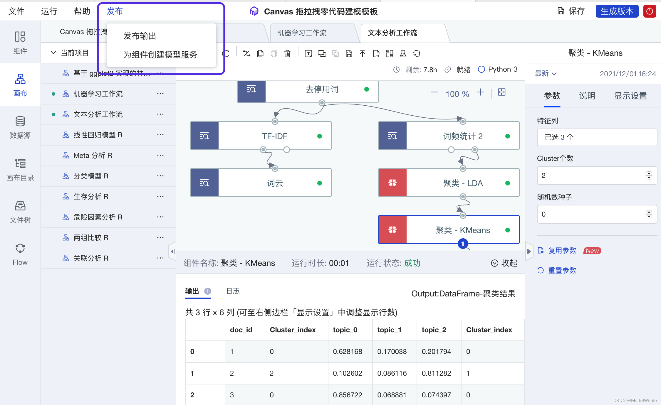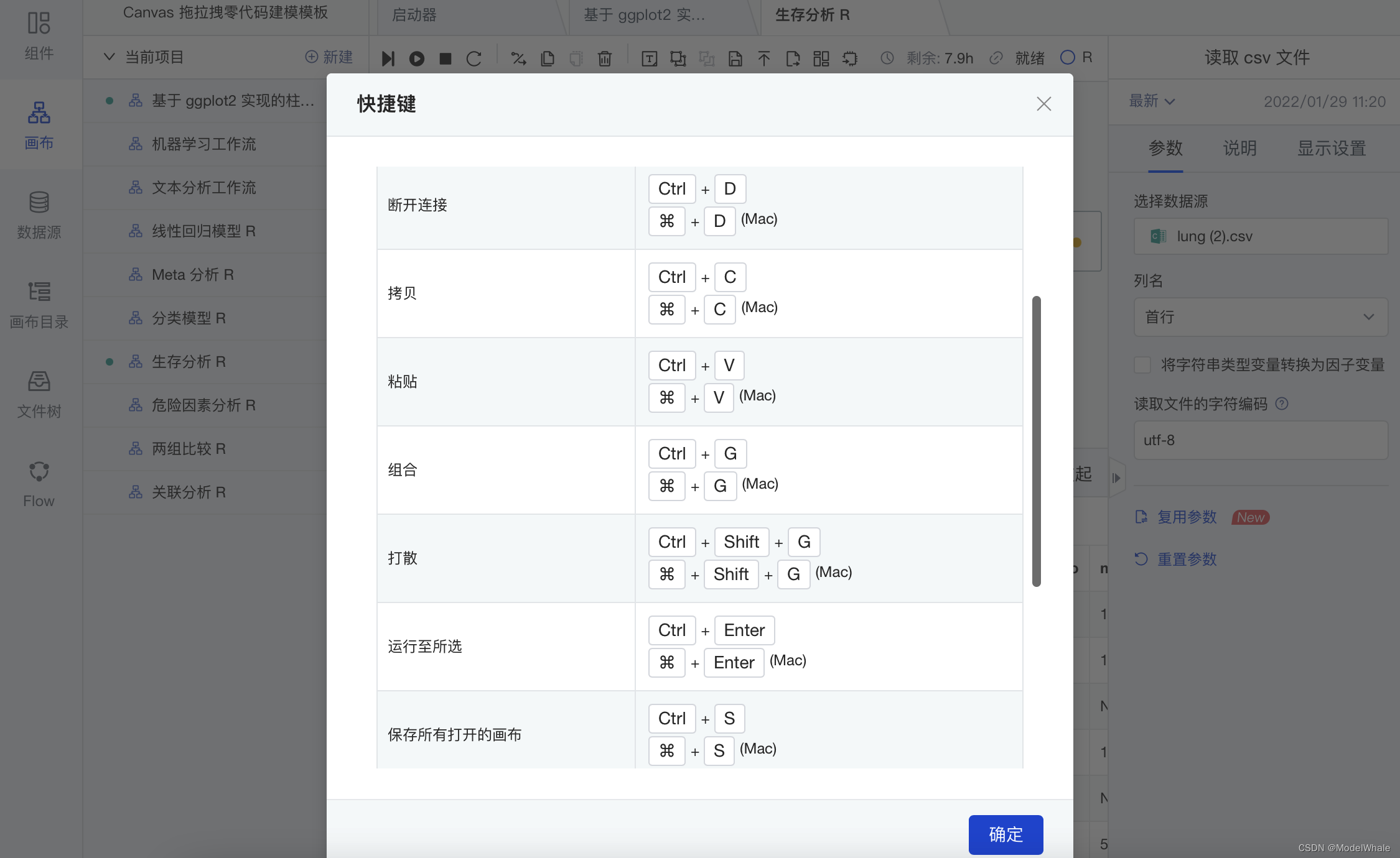 ModelWhale Canvas 提供经封装的算法组件供用户通过低代码/零代码的方式进行数据分析、模型应用工作,现已支持更丰富的快捷操作方式,给你更丝滑的使用体验,包括(1)支持通过快捷键复制/粘贴、组合/打散;(2)便捷的成果发布,诸如数据集、算法、模型服务;(3)支持画布内切换镜像,更多操作详见 Canvas 用户手册。
