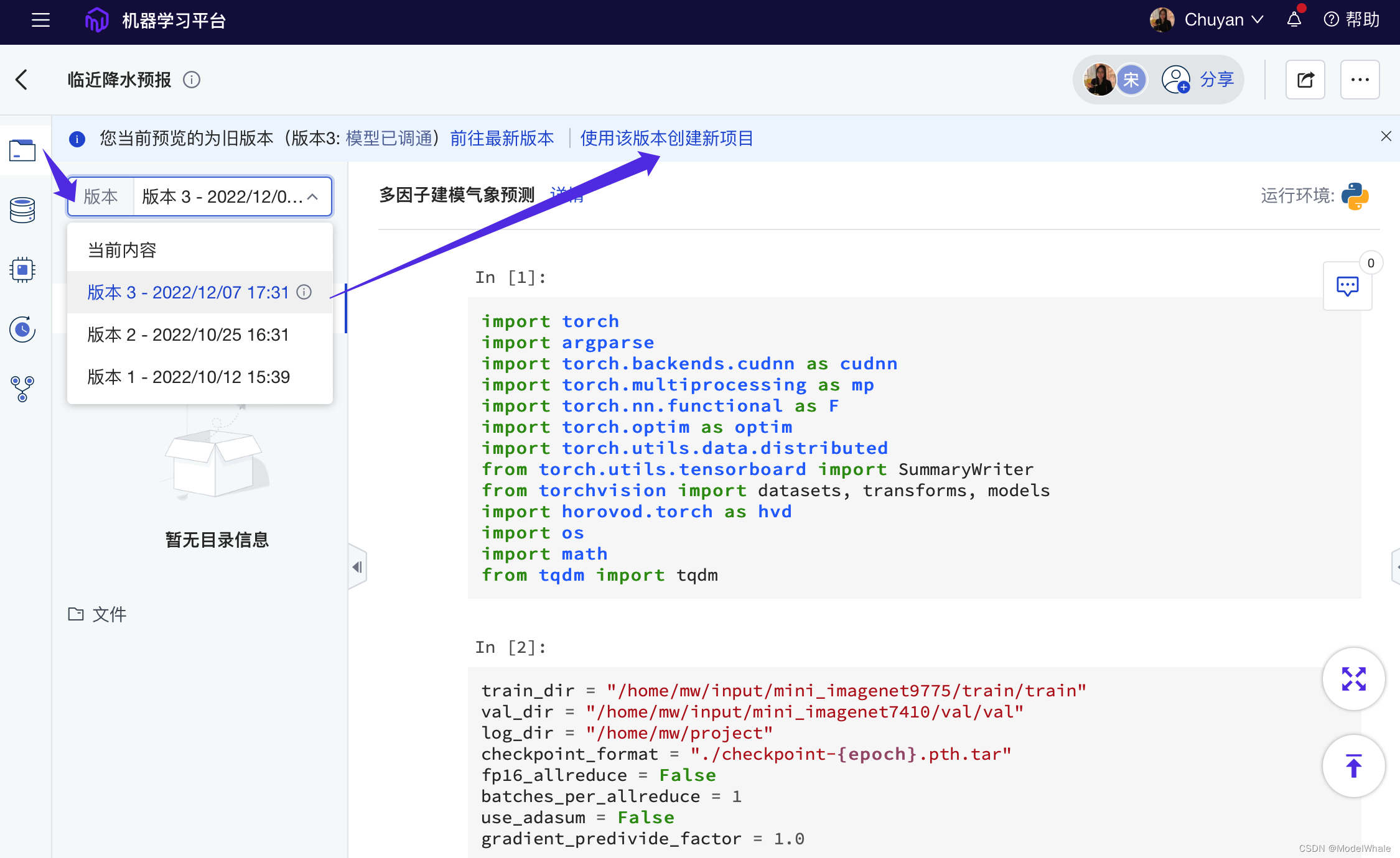 ModelWhale 项目支持通过【版本】进行内容记录和管理;现已支持使用“项目的某一版本内容”创建新项目(内容副本),以进行更便捷的内容复用。创建内容副本时,我们会自动拉取该版本依赖的镜像、数据,你也可以对此进行调整更改。