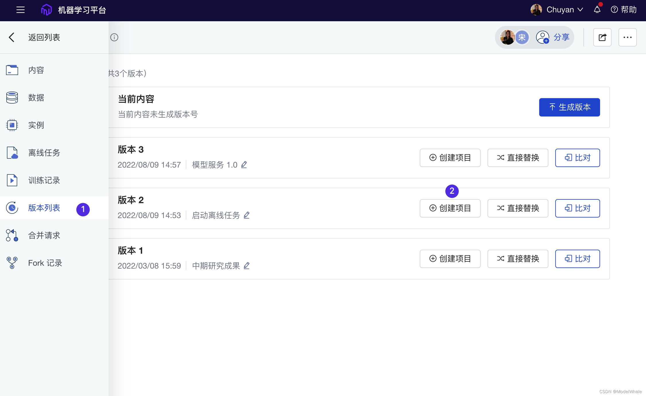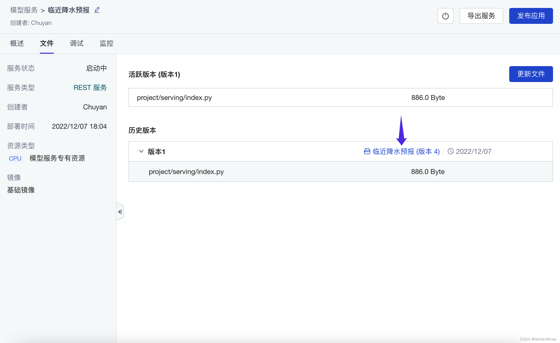 在 Notebook/Canvas 完成数据处理、算法研究后,你可以将 模型、数据集、算法 等研究成果进行发布应用。发布时,我们会默认记录该成果使用的项目版本(代码、数据、镜像等信息),帮助你后续更好地追溯成果来源。在成果应用页面(以模型服务为例),你可以选择对应服务版本进行项目追溯。