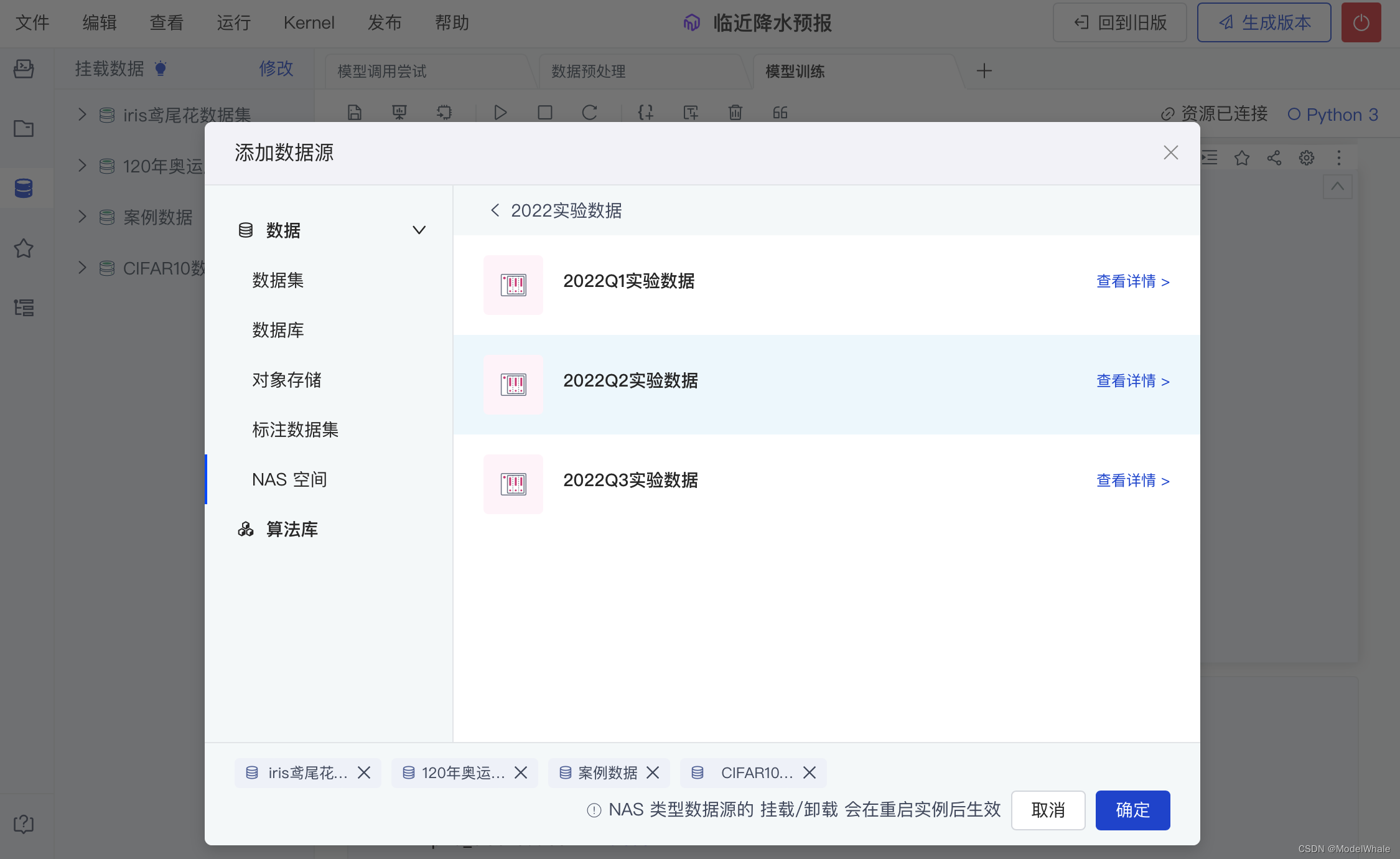 在 ModelWhale,经分析处理的数据支持导出为数据集,你也可以将相关数据写入 NAS 存储。此外,NAS 文件同样支持作为数据源挂载到在线分析环境(Notebook、Canvas)使用。
