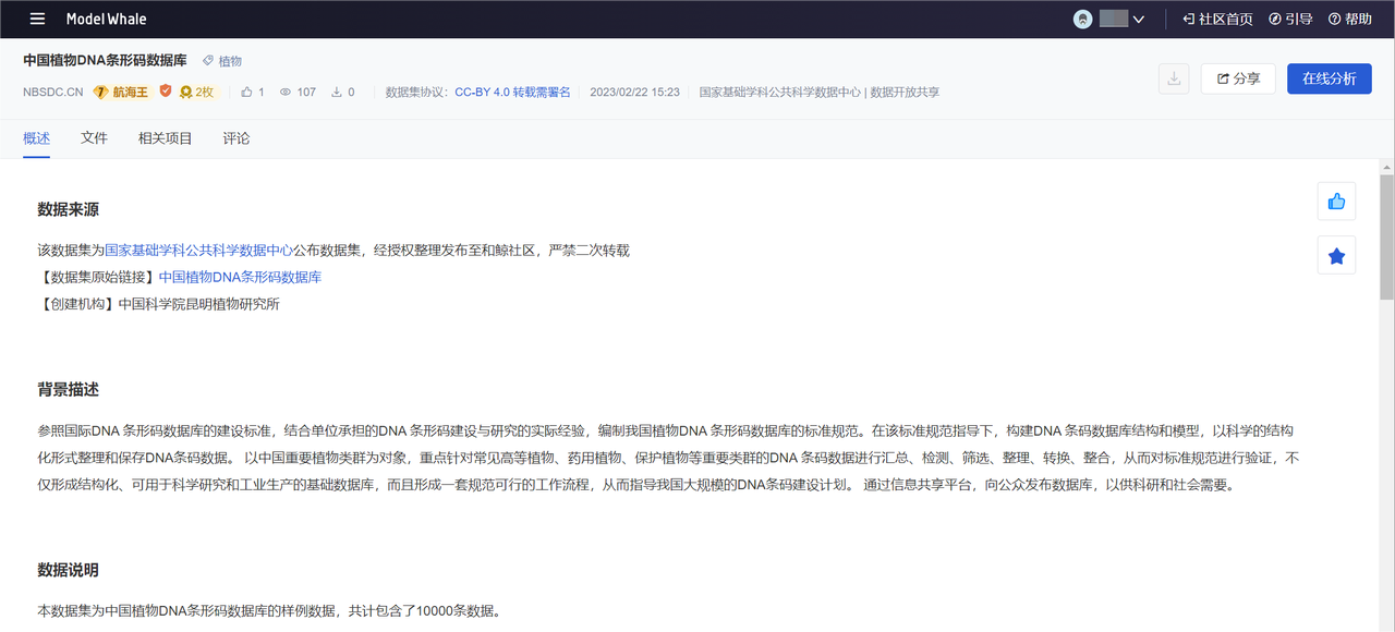 目前,NBSDC 已入驻和鲸社区(点此跳转专属数据社区主页),并发布了包含动物、植物、物理、化学等领域多个数据资源的元数据信息与数据样例,用户可通过数据集概述了解数据来源、背景、内含字段等基本数据信息,并获取完整数据下载链接。而得益于社区与数据科学协同平台 ModelWhale 的互联互通,用户更可直接基于数据样例在线创建项目,一体化实现从数据获取到分析出结果的完整工作流,这也便于作为数据所有者的 NBSDC 同步了解该数据集的实际应用情况。