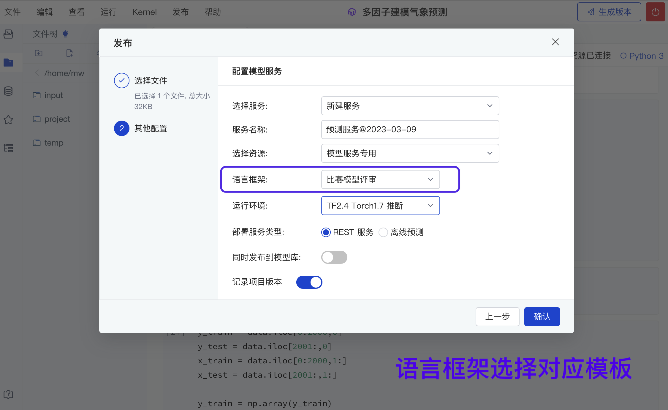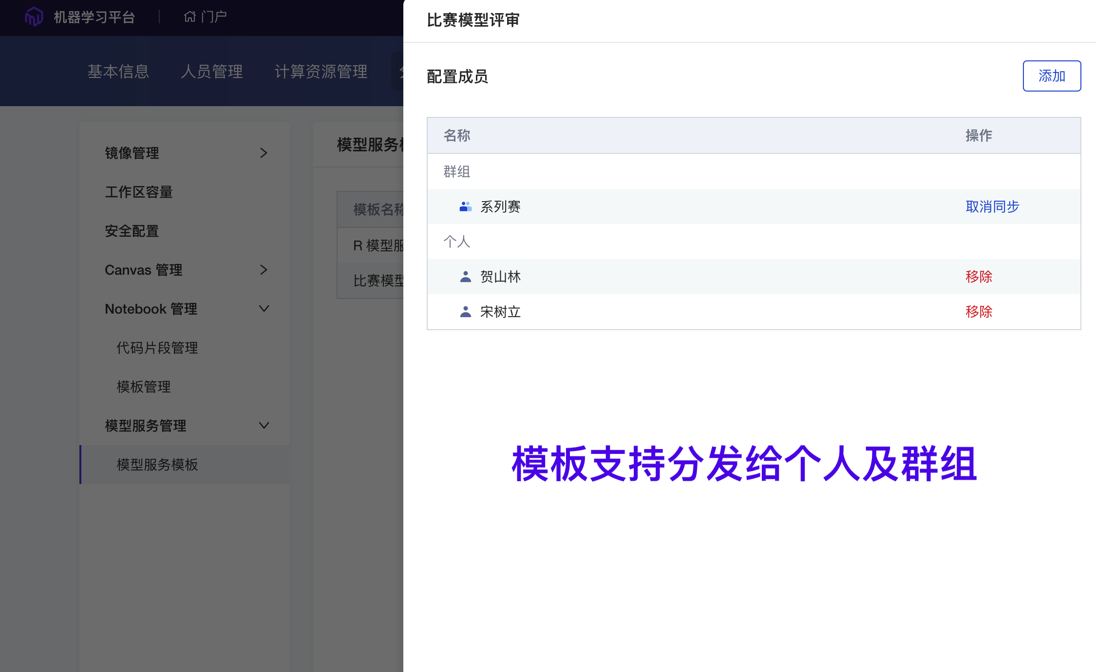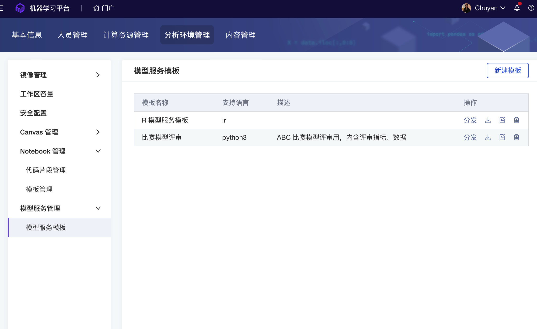 模型服务模板为用户提供启动服务时的胶水代码,包括 Flask 服务的启动及配置、引入用户编写的 index.py 中的 invoke 方法、返回值等。使用 ModelWhale 竞赛系统时,通过让选手发布相同语言框架的模型服务,可以进行更流畅的模型评审。现已支持管理员在组织管理对模板进行新建、编辑、分发等操作;模板编写方法,详见模型服务手册。