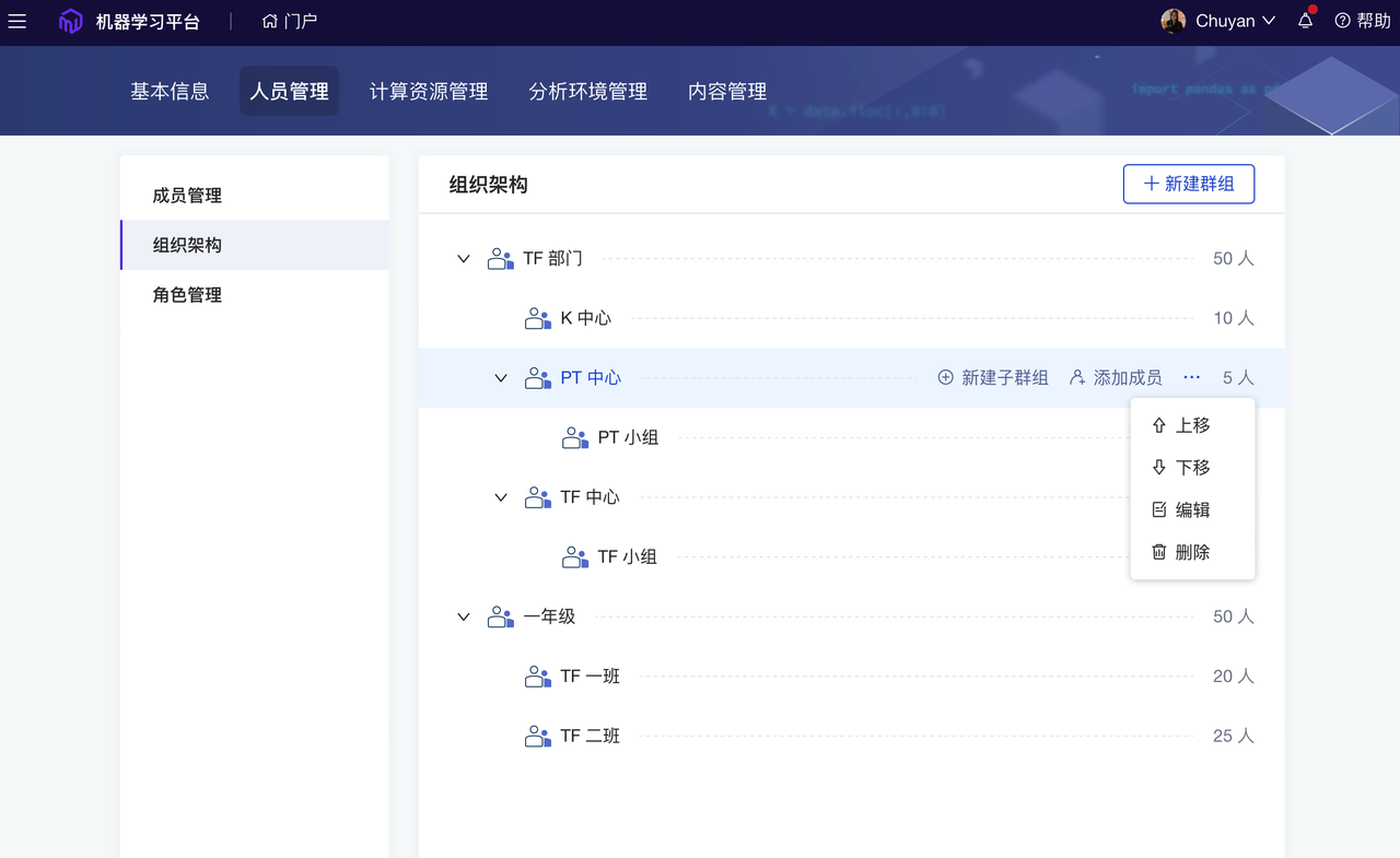 与企业人员管理类似,ModelWhale 使用组织架构、群组对成员权限进行批量管理,以树形结构构建多层群组(部门/中心/小组)。在搭建、维护组织架构时,管理员可以移动调整群组排序,实现灵活的组织架构展示;更多详见组织人员管理手册。