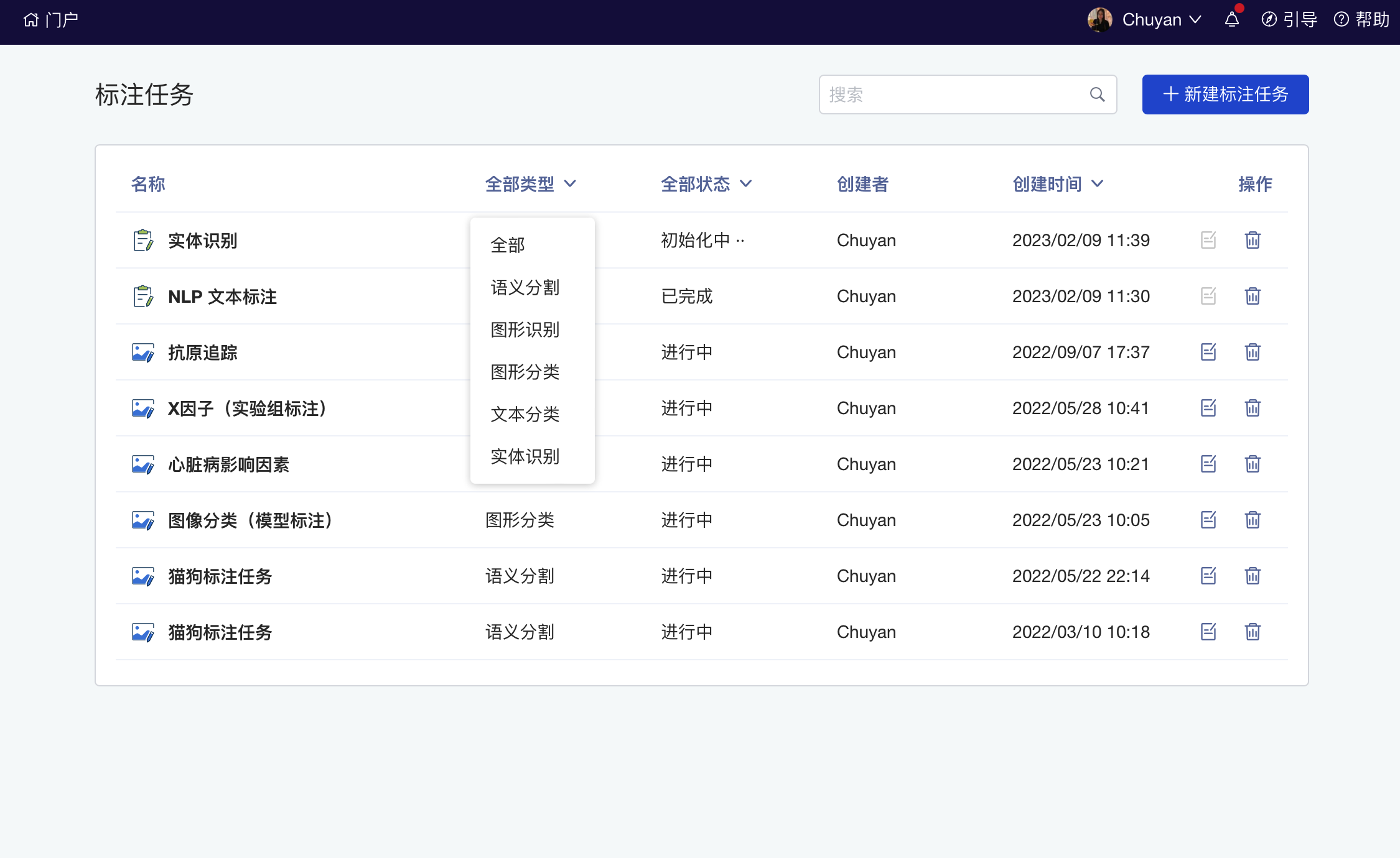 ModelWhale 支持多种数据标注类型,包括语义分割、图形识别、图像分类、文本分类、实体识别;也支持多人标注、模型标注。现标注列表已支持搜索、筛选、自动刷新等功能,以帮助你更好查询和管理标注任务;更多详见标注工具手册。