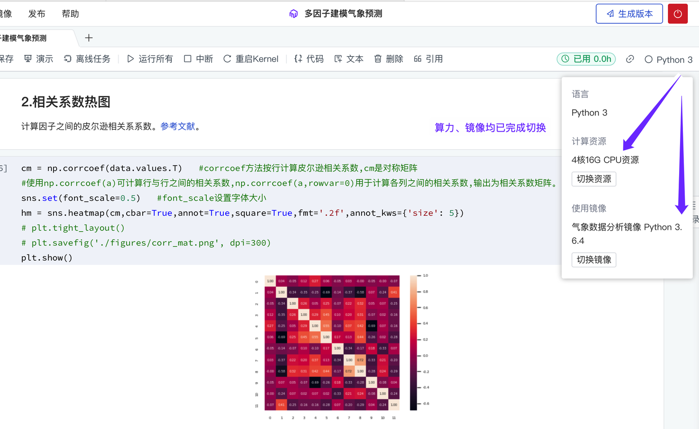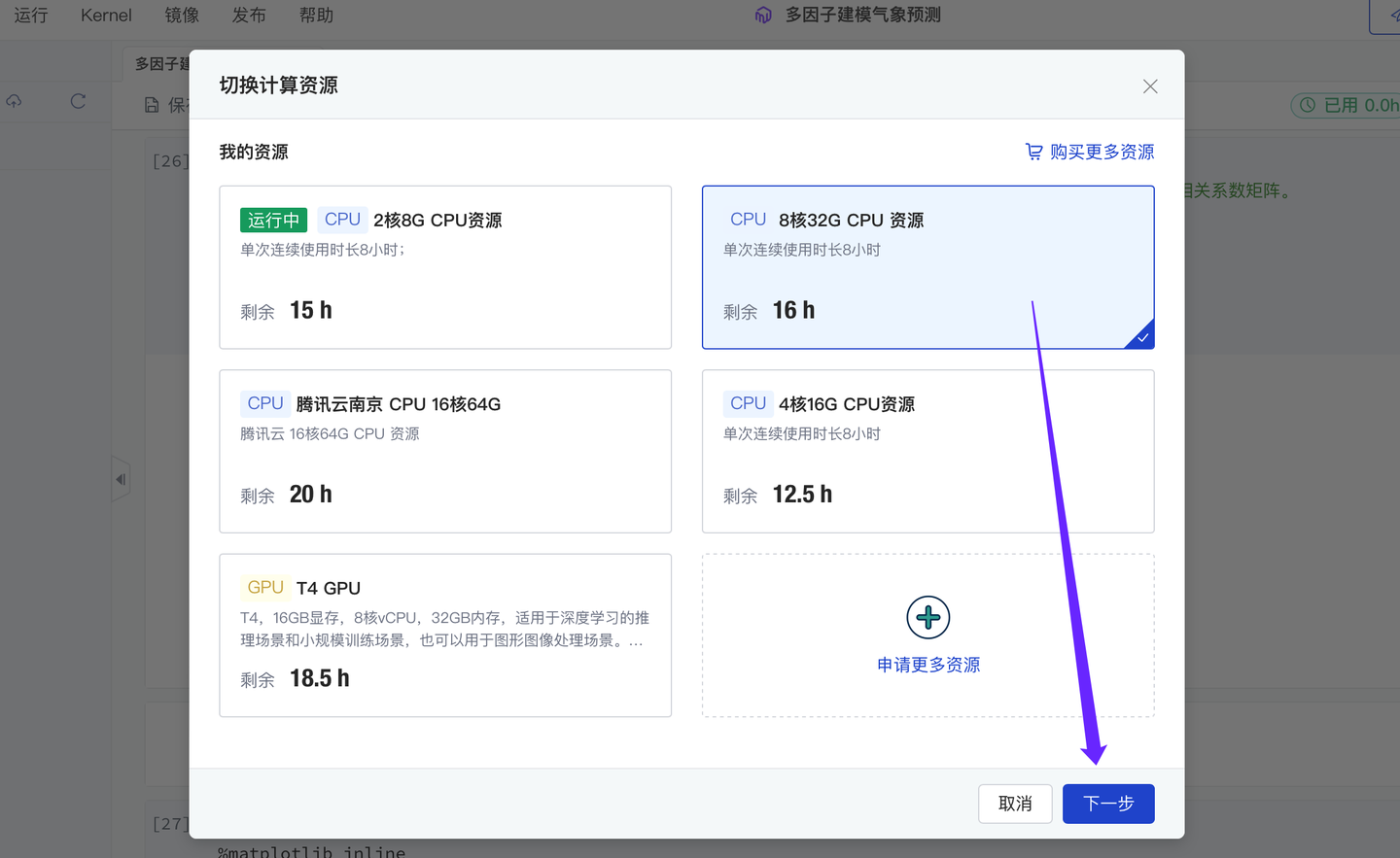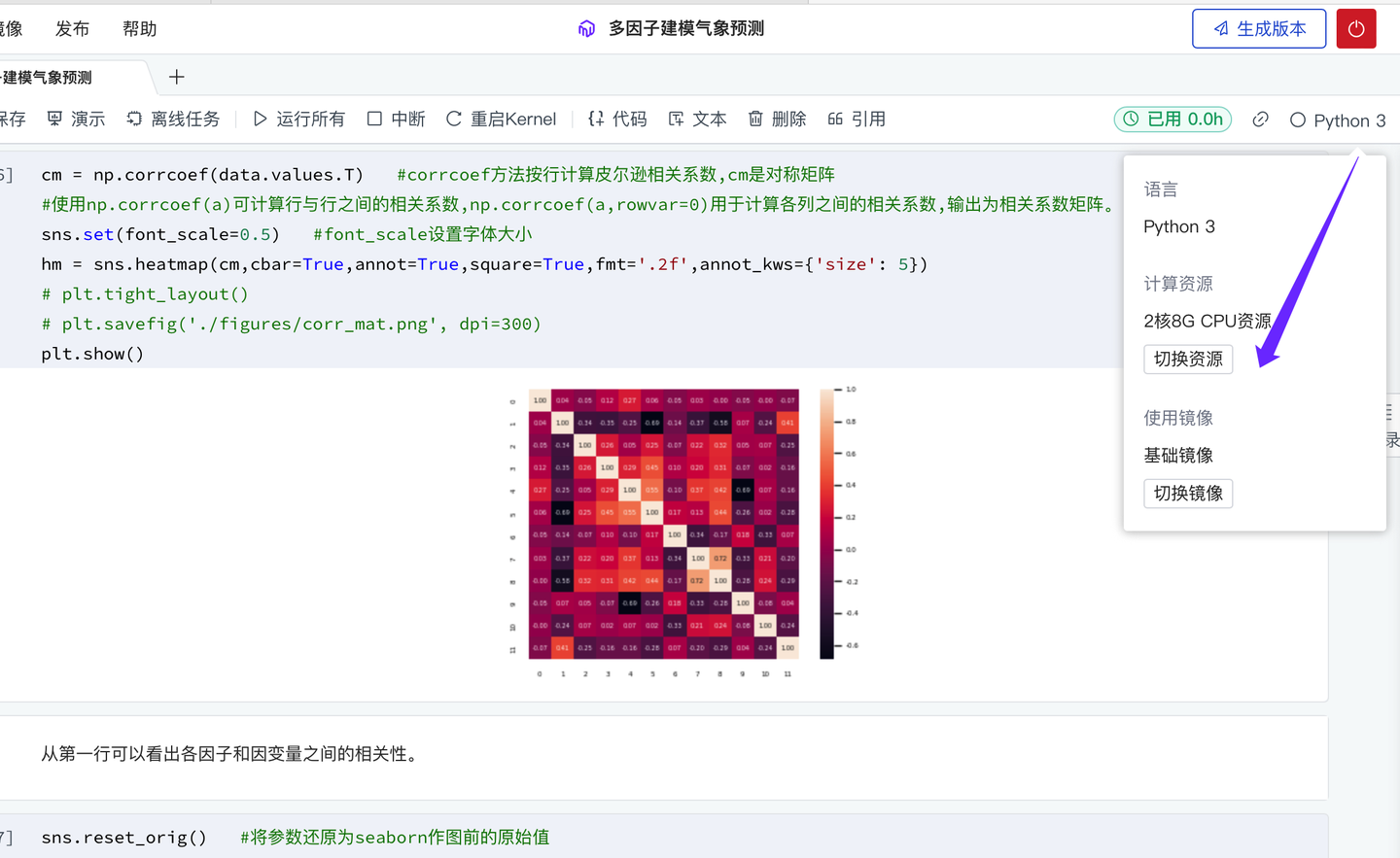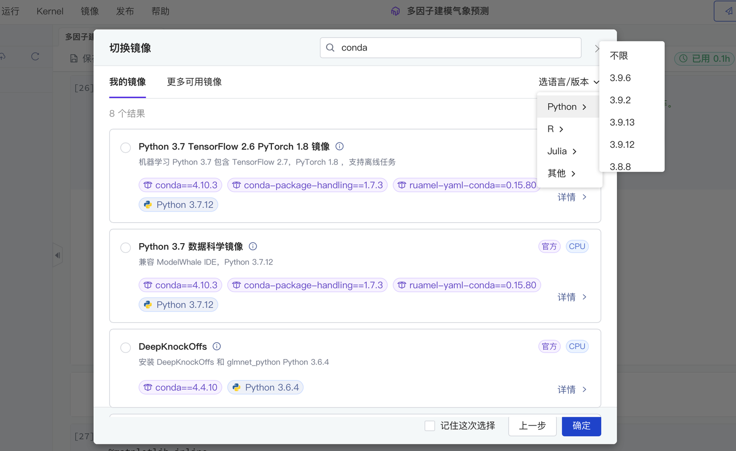 ModelWhale 支持灵活调度不同规格算力、便捷伸缩切换。你可以使用 CPU 算力进行代码调试、方法检验,再切换成高规格 CPU、GPU 算力进行全量数据处理、模型训练。在 ModelWhale Notebook 右上角,我们提供了快速切换资源的入口,帮助你更快达成这一目的:切换算力时,你还可以一并切换镜像,让平台为你构建新的云端运行环境,满足下一步的分析需求。