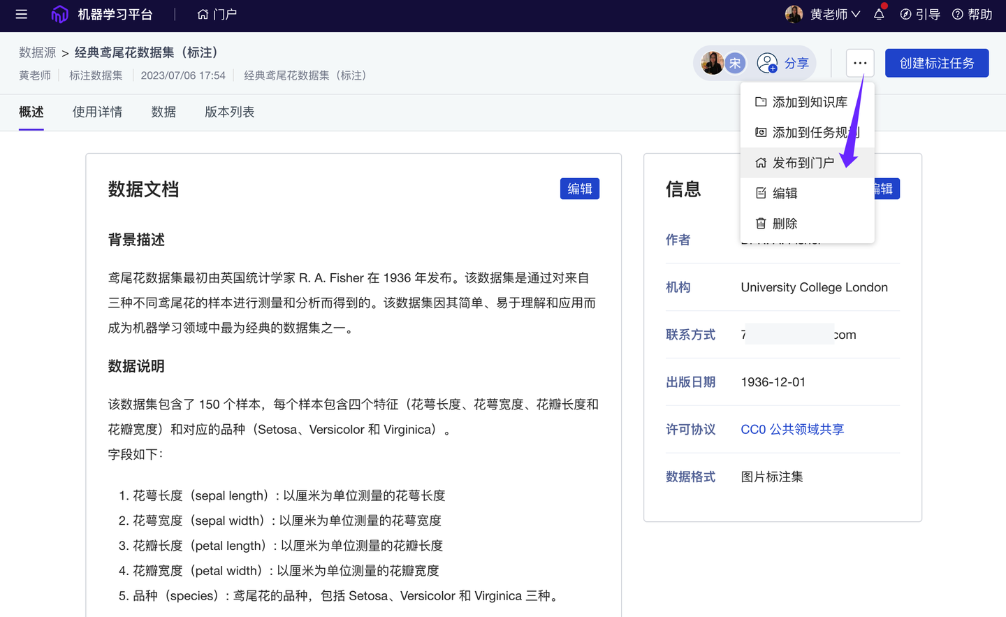 数据开放、成果共享可以发挥它更大的价值。ModelWhale 提供数据科学研究工具的同时,还为每个团队提供了“独立门户”,作为内容分享窗口,连接外部伙伴。除了管理员可以将组织内的精选内容公开到门户外,现在也支持组织成员自主申请公开,实现门户内容的快速搭建。以组织数据为例,成员点击「发布到门户」、完善规范概述后提交申请;组织管理员审核通过后,即完成内容公开。