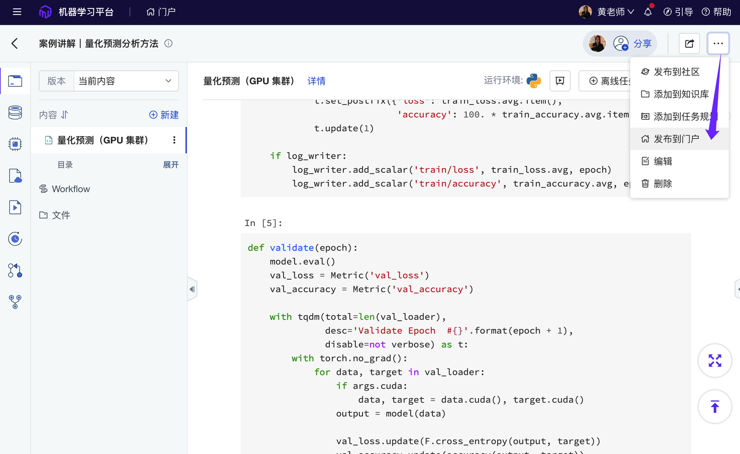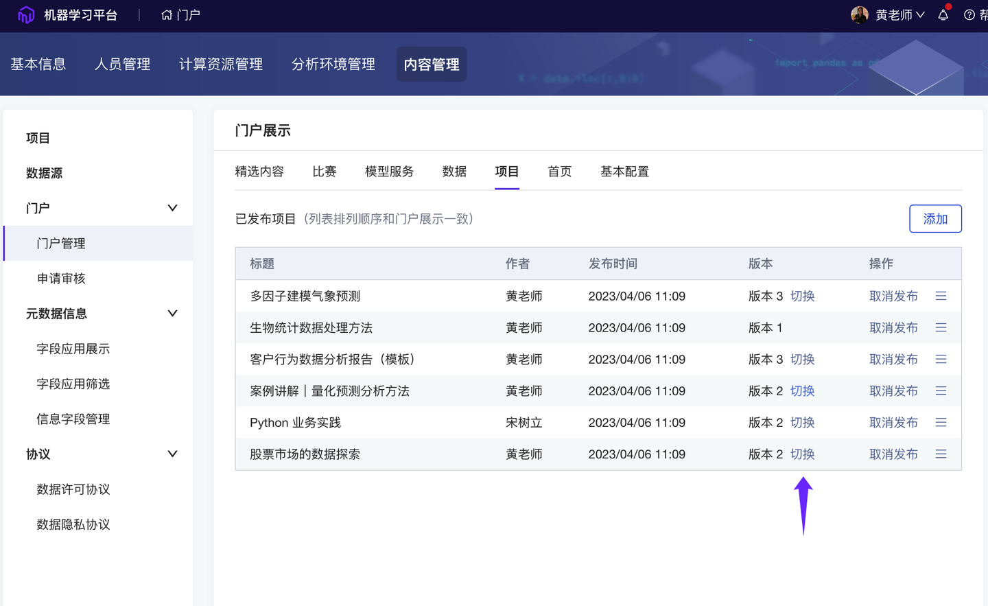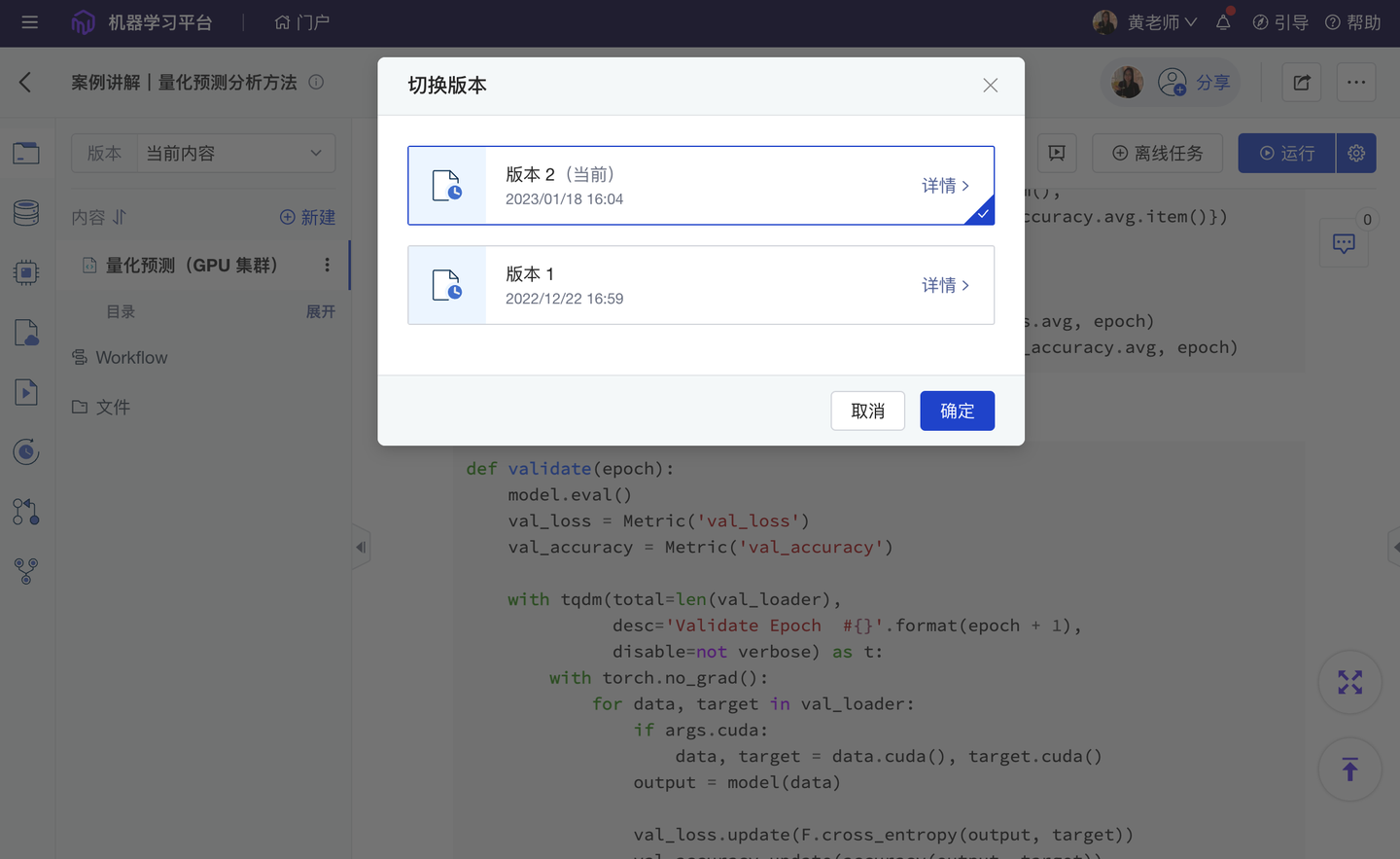 ModelWhale 代码项目支持“版本管理”,帮助用户记录和追溯每次更新迭代。当代码项目发生了内容更新、迭代,门户内容需要进行对应调整时,用户可以自行“切换版本”(无需再次申请内容公开),组织管理员也可以在管理后台操作“切换版本”。