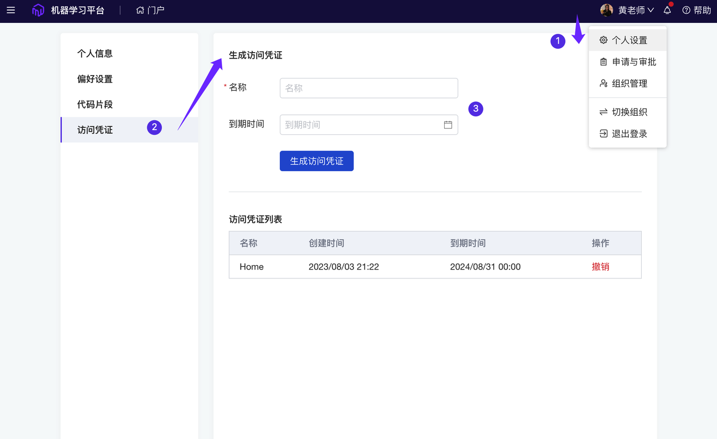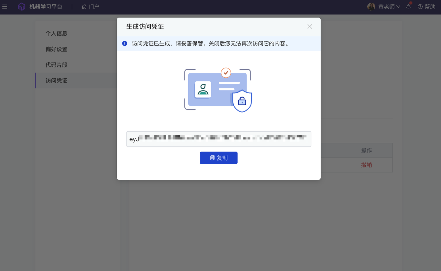用户可以按需生成 API token 访问凭证,通过 token 调用 ModelWhale 里的接口:点击「生成访问凭证」后,我们会为你生成一串 token 字符,关闭弹窗后无法再次访问,建议妥善保存。你可以设置访问凭证的名称、到期时间,也可以撤销已有访问凭证。