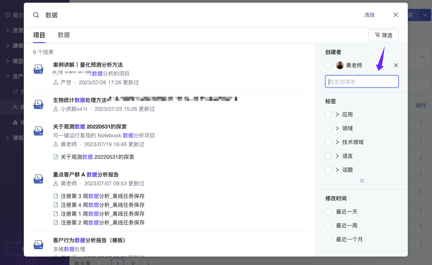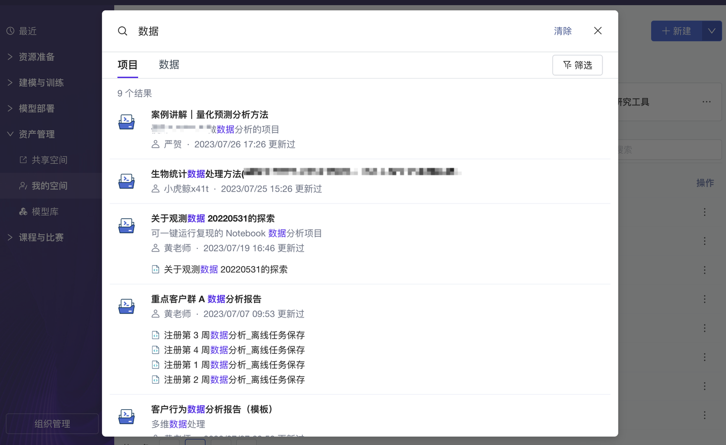 当我们要解决的问题变得复杂,不可避免会在过程中产生很多内容。ModelWhale 项目、数据,现已支持更强大的搜索及筛选功能:(1)搜索范围包括所有“自己创建的项目、数据”及“他人分享给我的项目、数据”;(2)支持通过名称、简介、概述、元数据字段,搜索相关内容;(3)还可以通过标签、创建者、许可协议、时间,筛选所需内容。