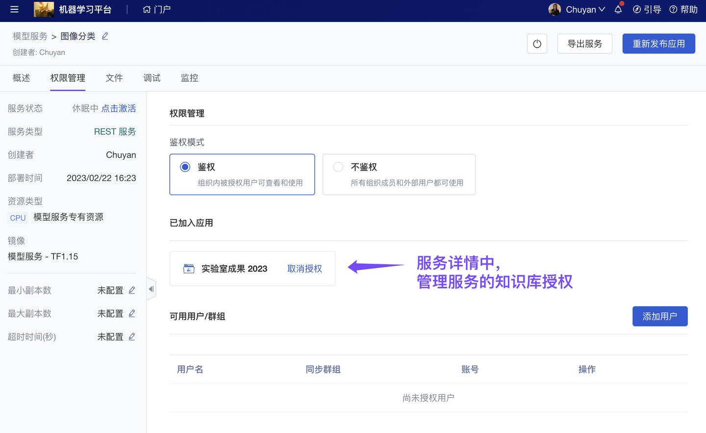 你也可以在对应的模型服务中,对服务所在的知识库进行管理(比如,取消授权)。