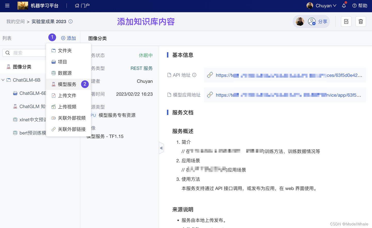 ModelWhale 知识库让你的内容整理、成果沉淀更加有条理,除了支持添加汇总诸如:项目、数据、文件、视频、链接、文件夹等多种内容格式外,现也已支持添加“模型服务”到知识库中。将成员添加为知识库协作者后,他们即可浏览和使用知识库内的所有内容,包括可以查看 ModelWhale 模型服务的配置信息、文档说明、API 地址等。