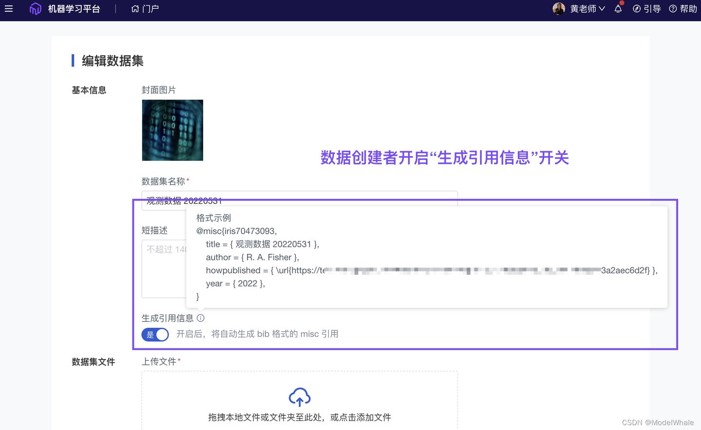 作为数据创建者,你可以在新建/编辑数据集时,选择是否打开“生成引用信息”的开关。打开后,ModelWhale 会结合“元数据”的填写信息,自动生成对应文本字段,你无需重复填写。