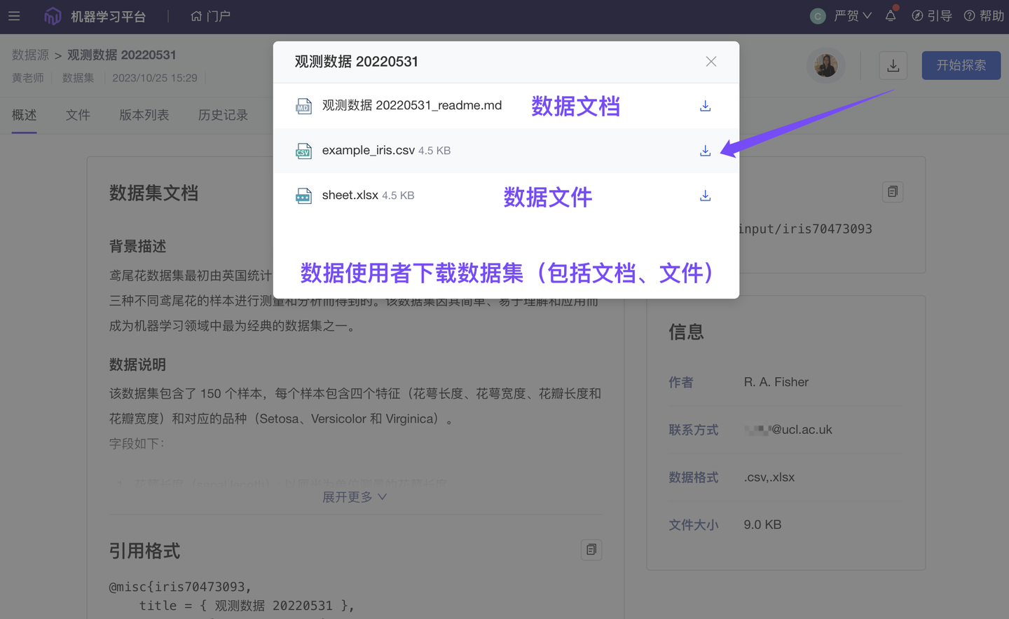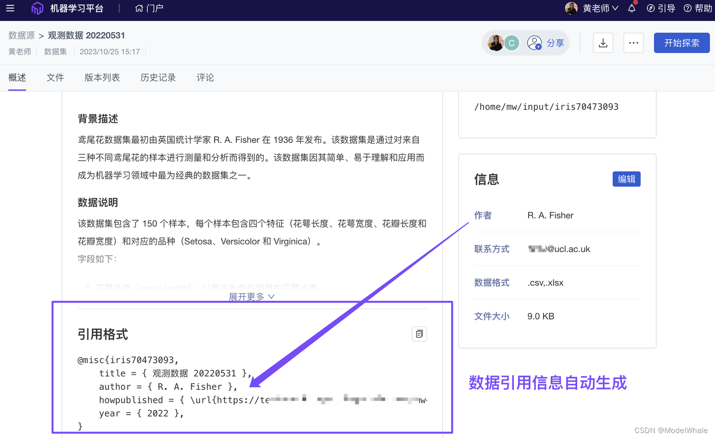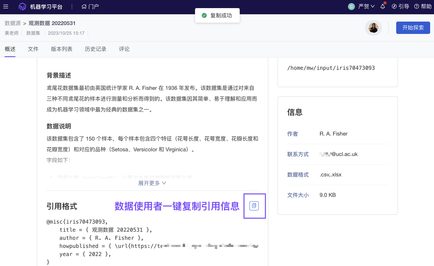 ModelWhale 提供规范的数据引用格式:数据使用者可以一键复制数据引用信息,规范地标记数据来源;下载数据时,也支持一并下载数据文档(包含“元数据”、“引用信息”这些标准化描述信息)。
