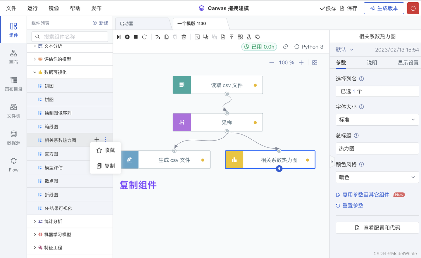 算法工程师可以使用 ModelWhale Canvas 将算法封装成 Canvas 拖拽组件,业务方(比如医生、算法初学者)使用 Canvas 组件即可零代码调用其中算法。ModelWhale 官方提供了常用的数据分析、机器学习算法组件可以直接使用;当官方标准的输入、输出、参数、代码无法满足需求时,算法工程师也可以【复用官方组件】:在其基础上做延展、修改。
