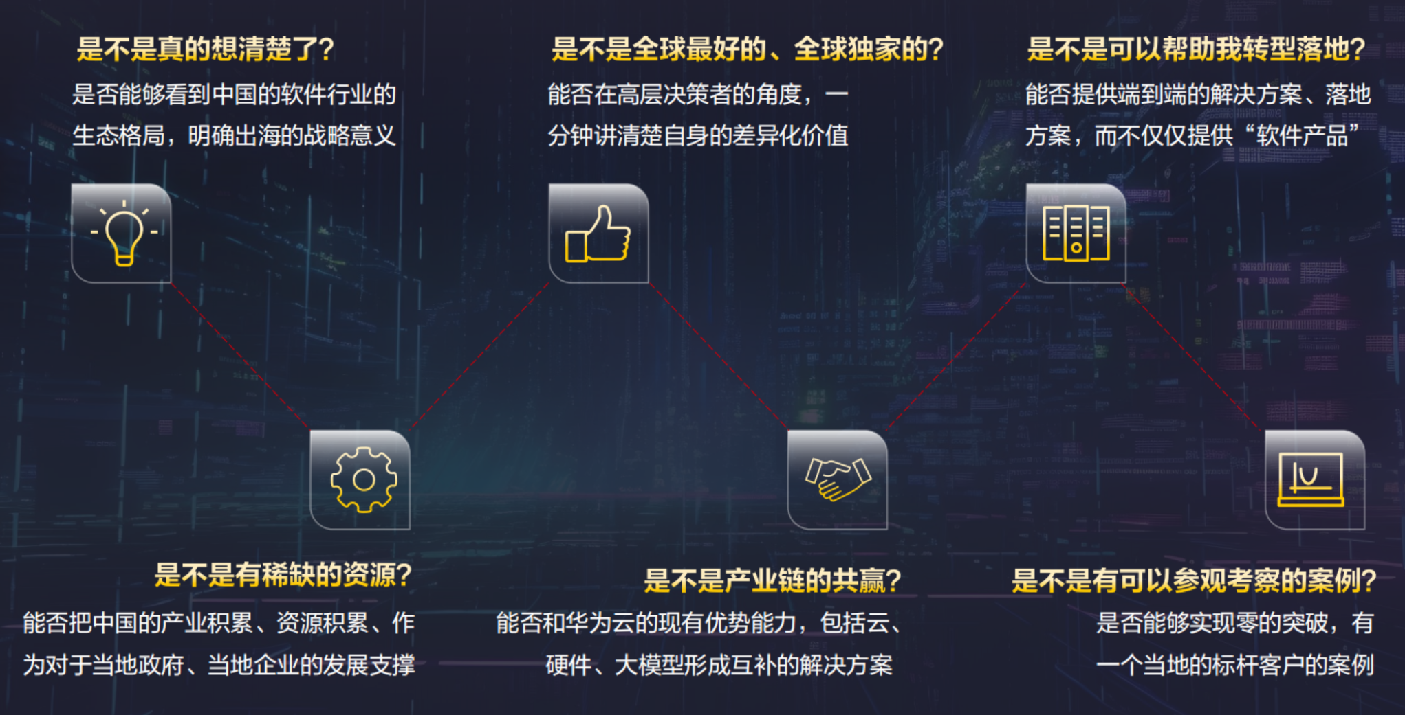 - “是不是真的想清楚了?”(是否能够看到中国的软件行业的生态格局,明确出海的战略意义。)