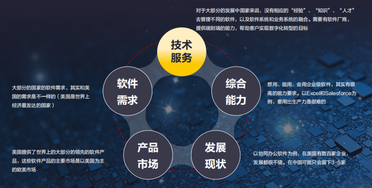 “无论任何国家,对于大部分的客户来说,数字化转型都是一个成本很高、难度很大的长期需求。美国的软件企业,并没有充分满足这个需求。”