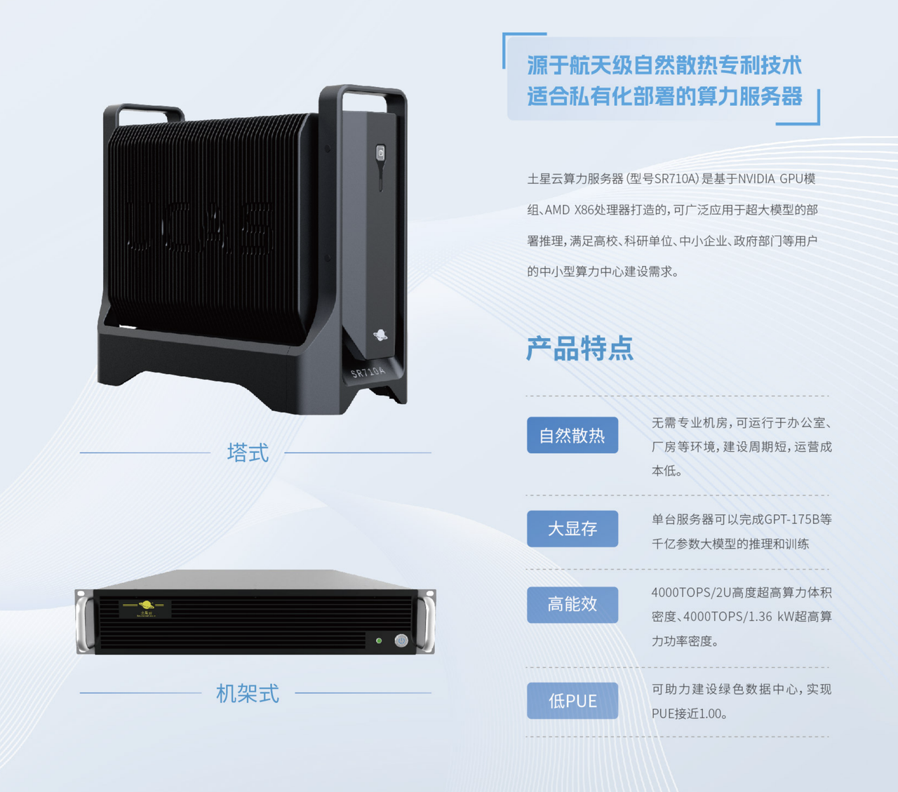 其自主研发的 土星云算力服务器(型号SR710A)是基于 NVIDIA GPU 模组、AMD X86 处理器打造的大算力设备,具有自然散热、大显存、高能效、低 PUE 等特点,可广泛应用于大模型的推理和分布式训练,满足高校、科研单位、中小企业、政府部门等用户的中小型算力中心建设需求。
