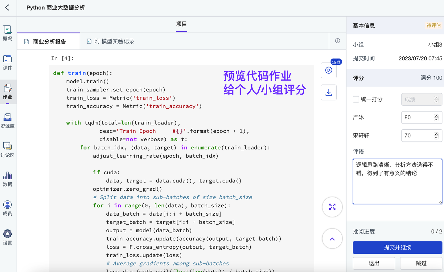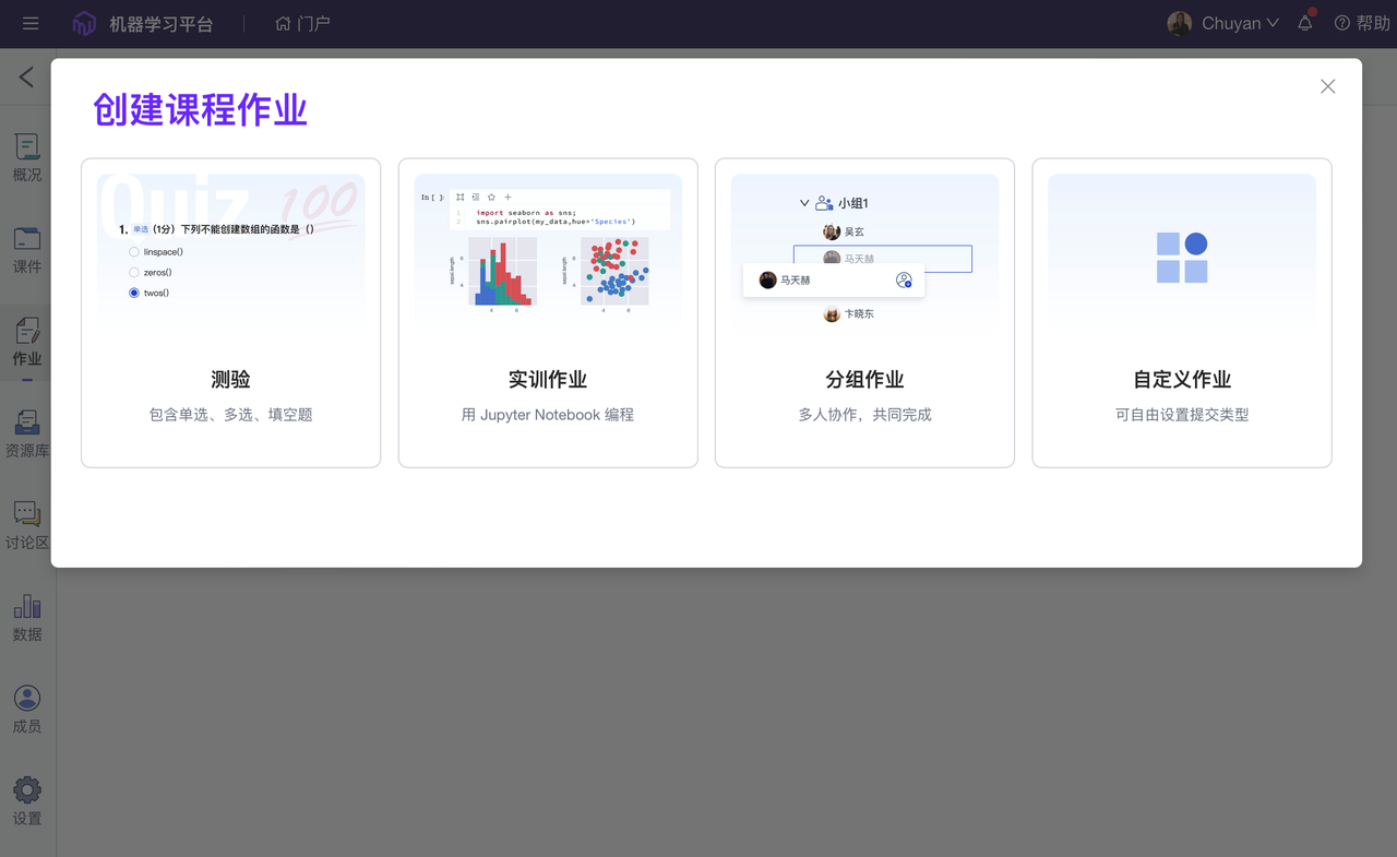 为促进高校教改,依据 OBE 成果导向的教育模式,平台帮助学生真实 Coding、快速理解数据科学方法、逐步形成数据科学思维。老师可以调用平台丰富的案例教材、教学工具,设计实践作业、分组作业、自动评审作业等,构建案例实训教学课程。教学平台本季度新增: