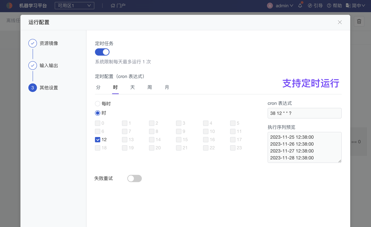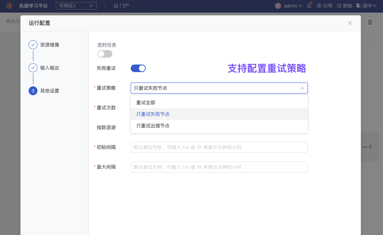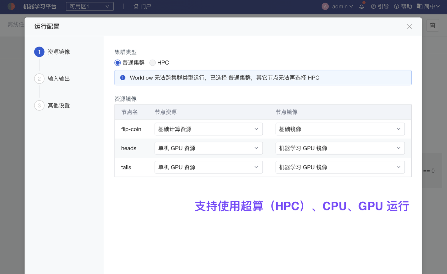 大小模型结合或多节点复杂任务,建议使用平台 Workflow 进行任务编排、并行计算。Workflow 任务节点支持 Notebook、Bash 脚本、Python 脚本、R 脚本多种类型;同时支持使用超算集群、GPU集群、GPU、CPU 组合运算,以及配置定时运行策略、结果重试策略。