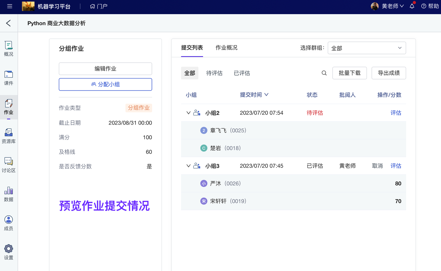 - 分组作业:支持区分小组得分/个人得分、批量设置/管理小组、作业在线预览评审、作业导出留存。