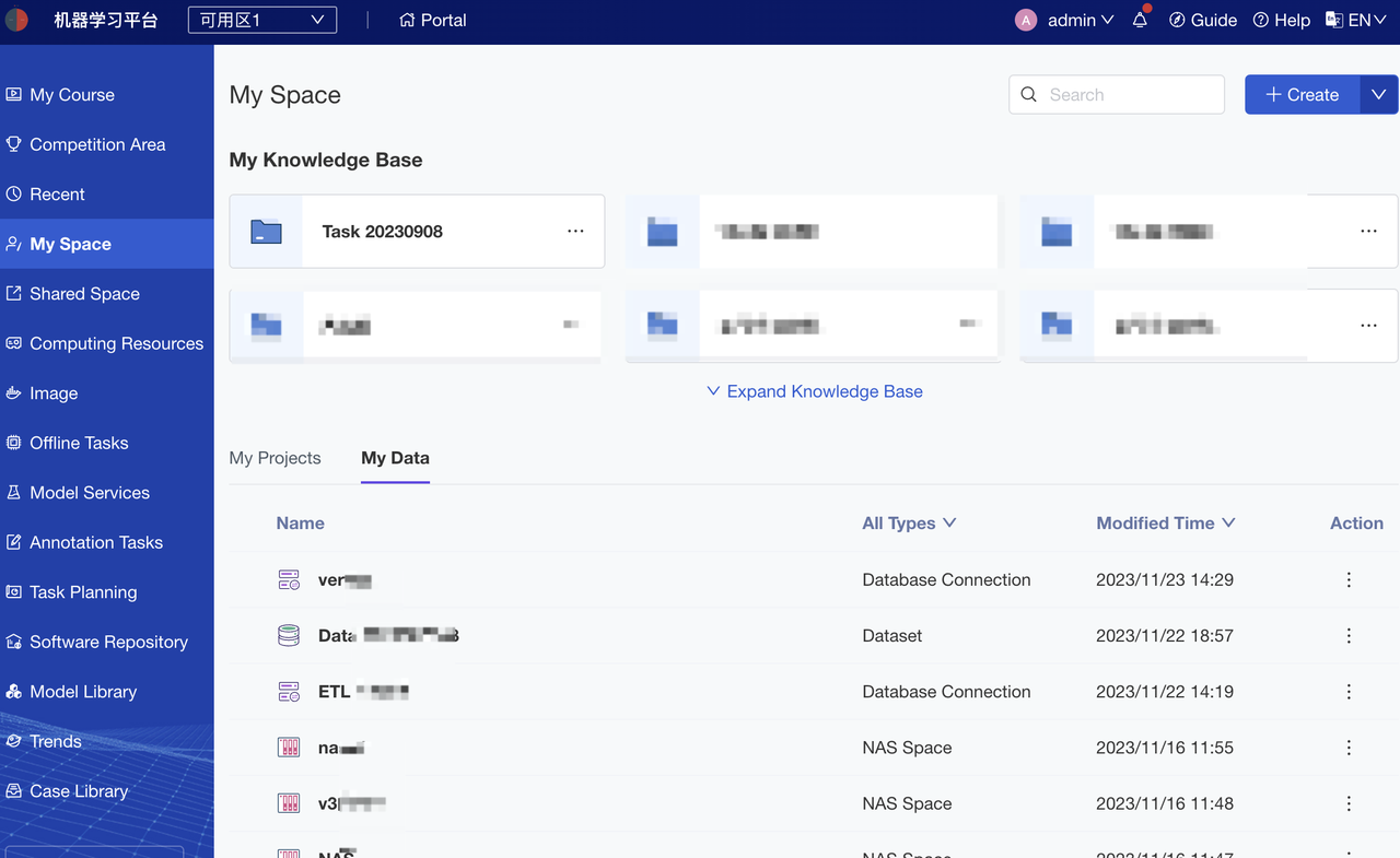 平台支持多种数据源的接入和使用,包括:关键数据成果(数据集)、研究源数据(NAS 数据源、Vertica 及其他常用数据库、对象存储)、其他第三方存储数据(服务接口调用、API 数据连接)、大模型 Common Data(超算自有存储)。