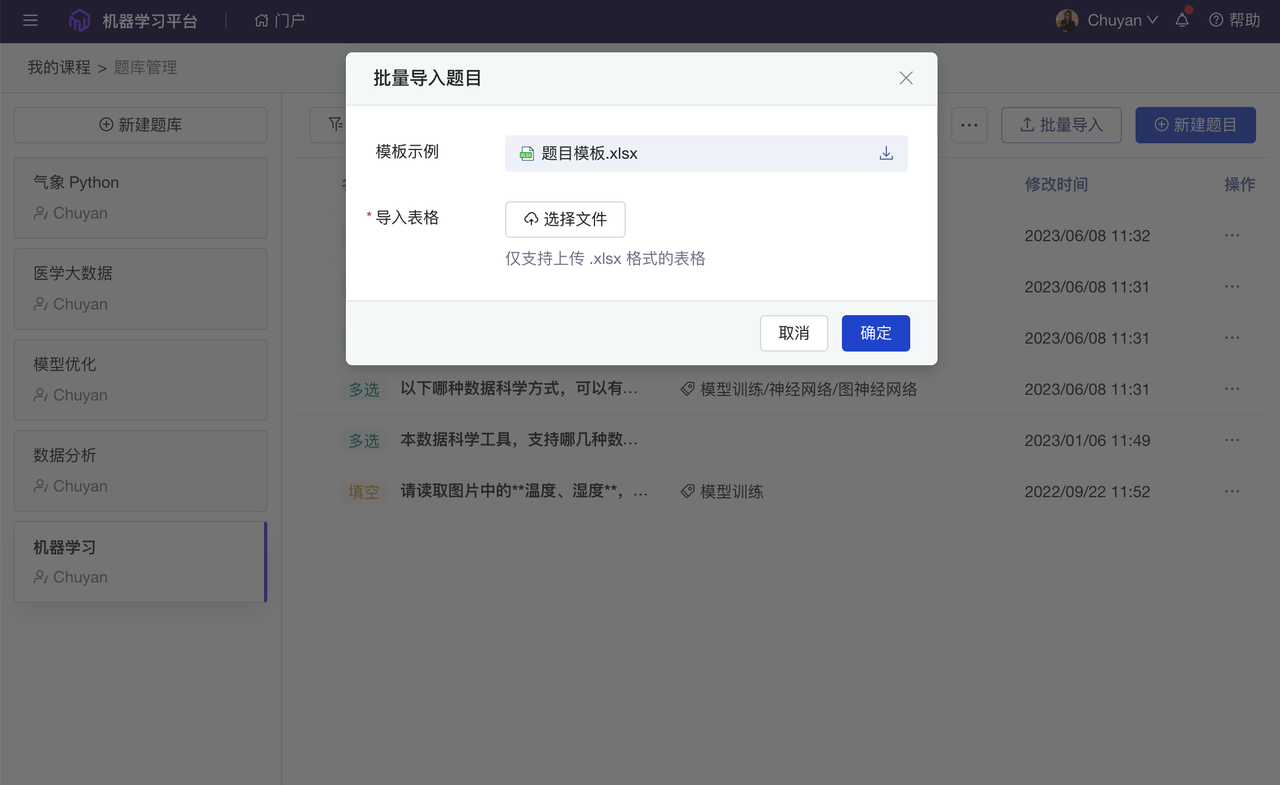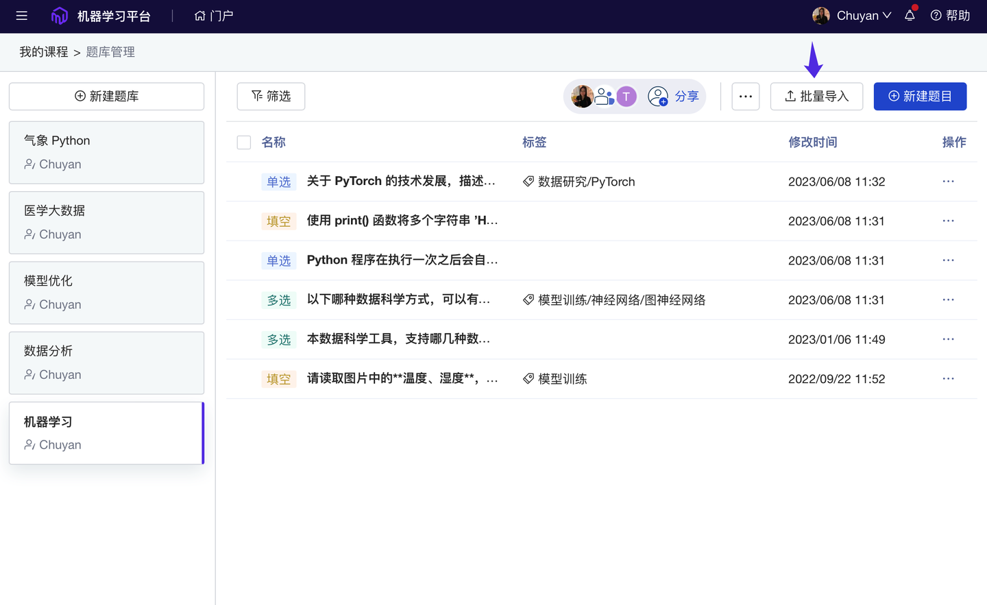 - 测验题批量上传至课程题库:更方便“课题组”迁移教学内容和“老师”复用调整。