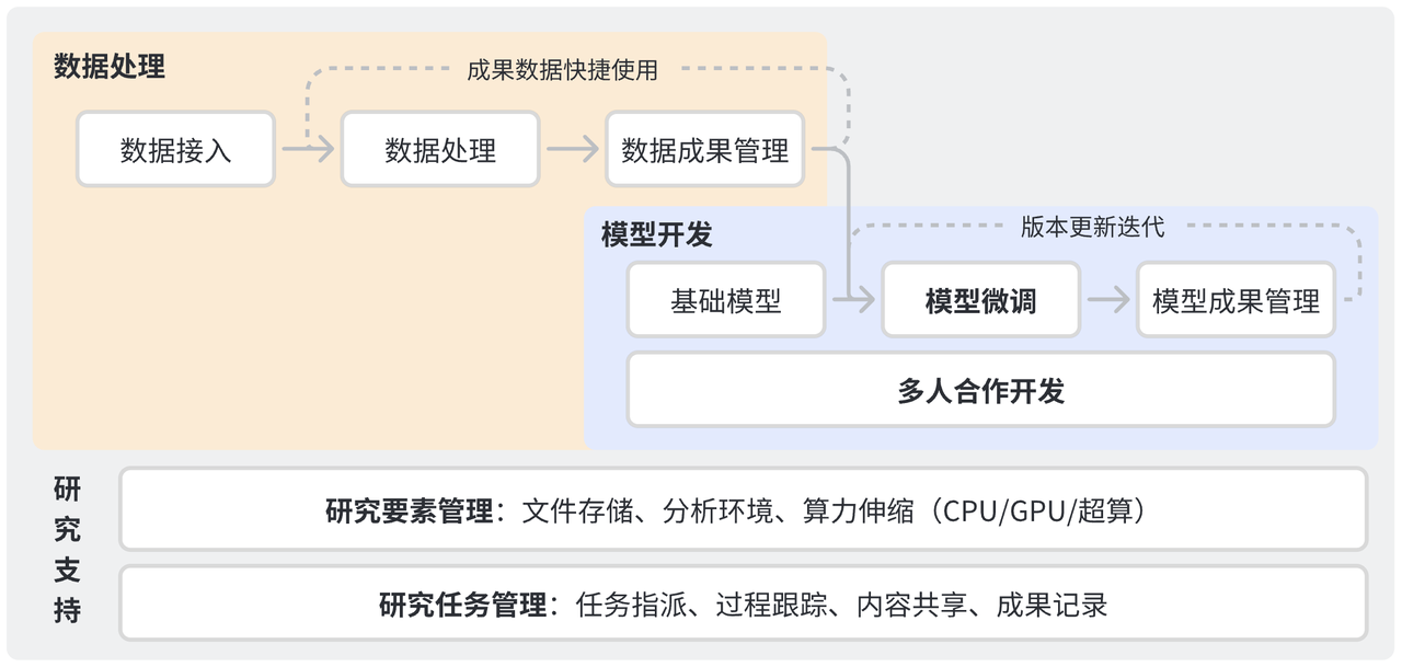 大模型(如 LLM)的开发训练对算力、存储、分析工具、多人协作工具均提出了较高要求,平台拥有适用于模型“开发 - 训练 - 部署 - 运维”的全流程基础设施,可帮助工程师、科学家们更好地进行大模型开发训练、多人协同研究以及其他 AI for Science 分析探索。