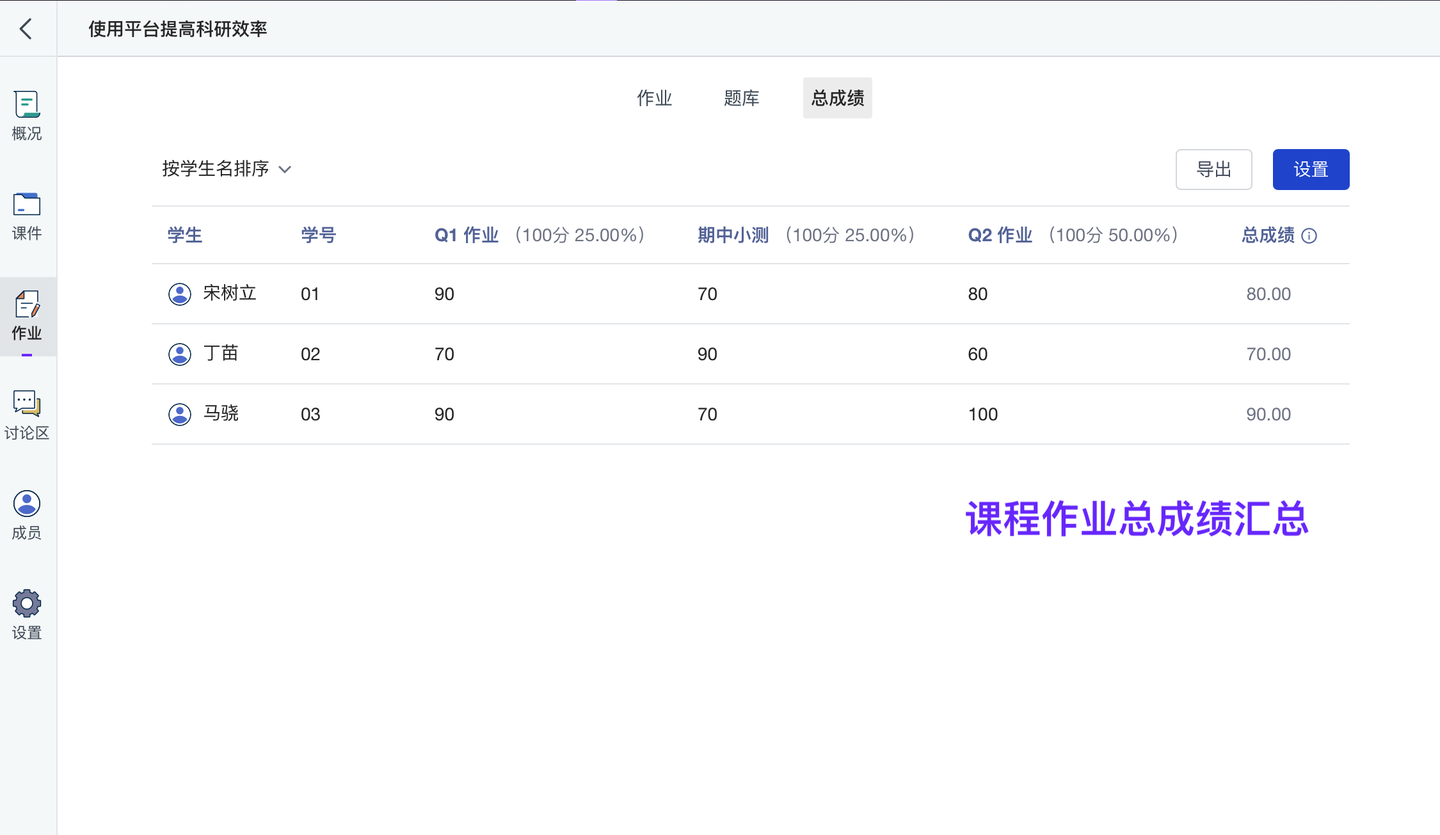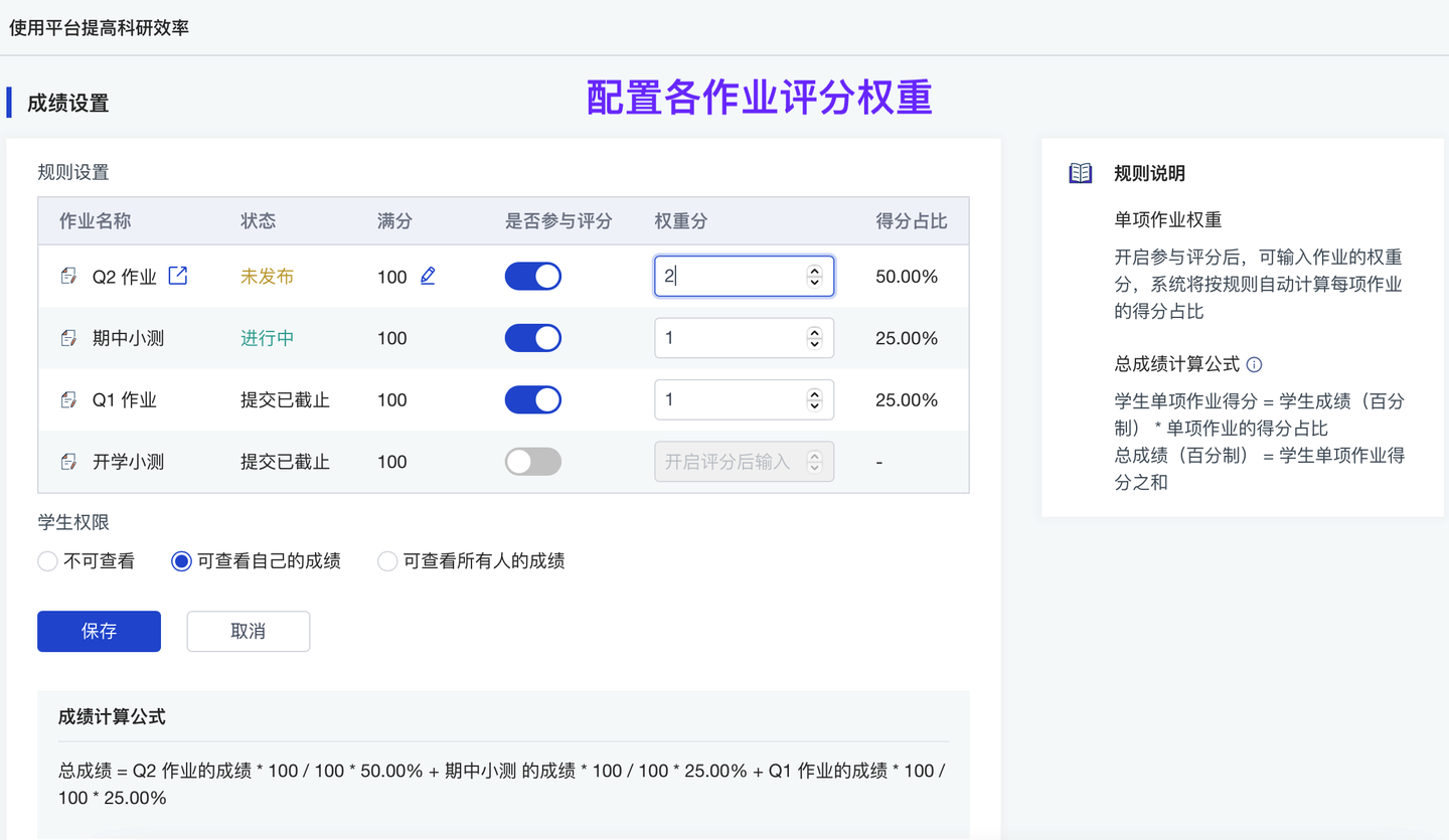- 也优化了结课存档相关设施,如:分作业权重配置及总成绩计算导出、课程归档、课程复用等。