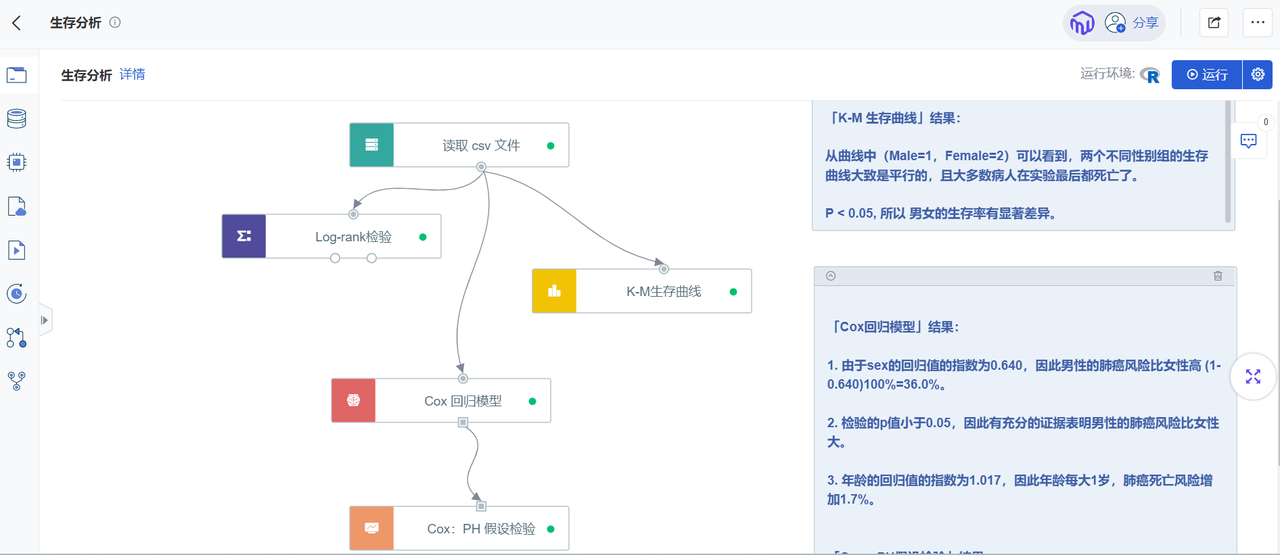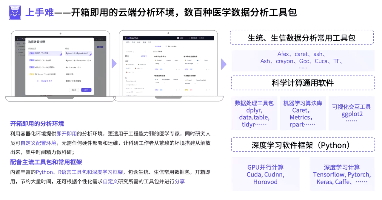- 开箱即用的云端分析环境,内置数百种医学数据分析工作包,可以帮助医学生跳过环境配置,快速进入到医学数据分析场景;