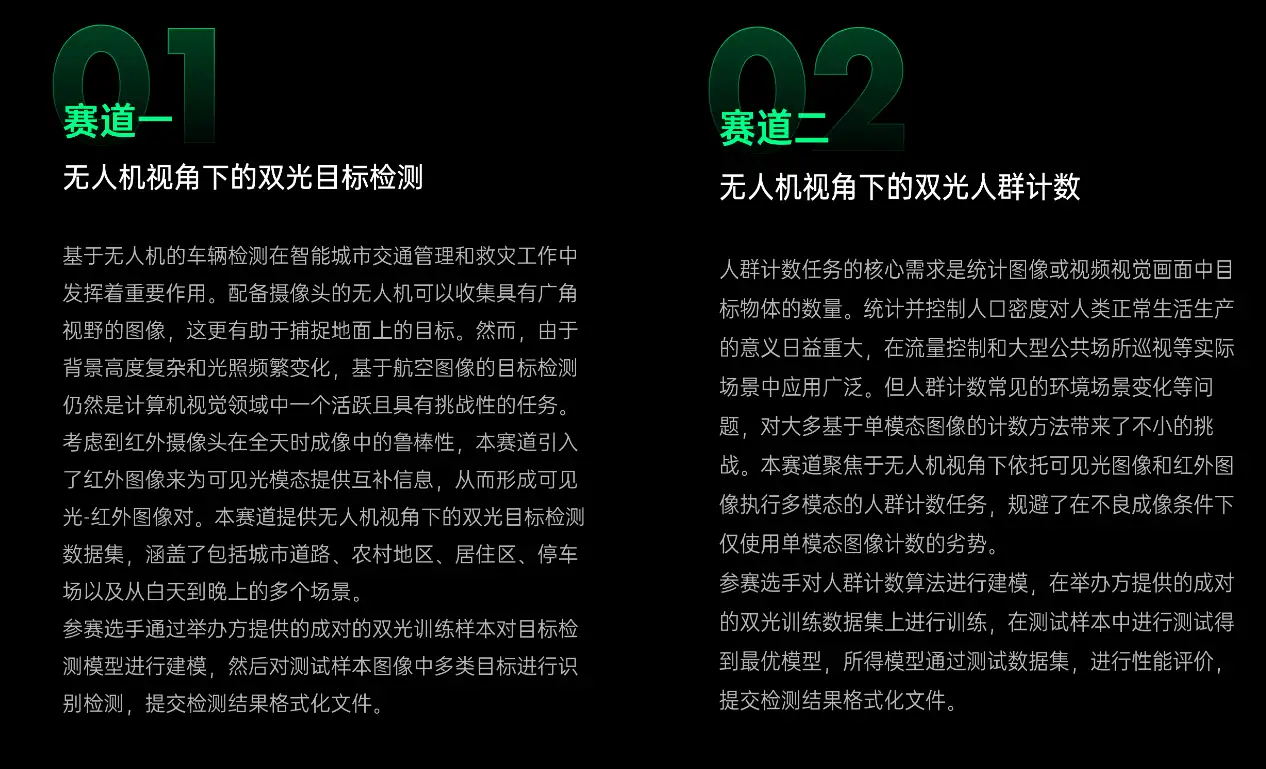 今年的赛题设计同样着眼于多学科交叉的前沿领域——计算机视觉,提供了两个富有挑战性的赛道:“无人机视角下的双光目标检测”与“无人机视角下的双光人群计数”。算法类竞赛的赛题应既具备高度的可解性,又不失挑战性和创新性,对此,和鲸科技作为协办单位凭借多年赛事组织经验,从数据的甄选评估、赛题价值分析、难度定位等多个维度提供了赛题保障。选手们完成报名后,即可在和鲸 ModelWhale 赛事平台上获取详尽的赛题说明和相关数据集。