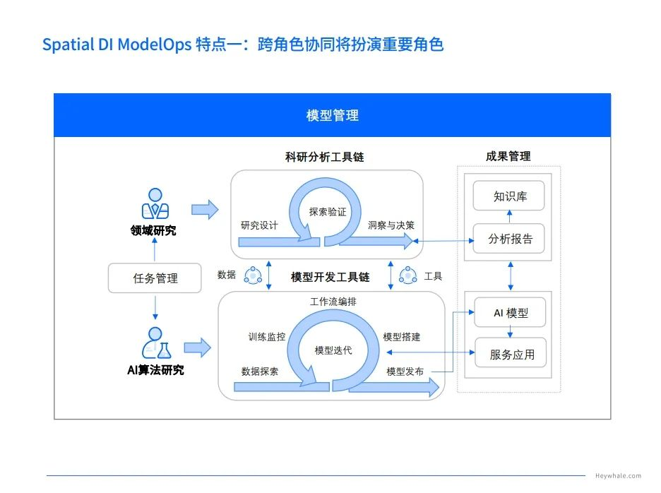 首先,专家的知识与数据驱动化知识的结合是这一过程的关键。在讨论整个模型生命周期管理时,我们发现跨角色的协同扮演着重要角色。这主要体现在两个方面:一是领域专家对已有科研数据形成科研分析工具链的过程;二是AI算法模型的不断迭代过程。这两个过程并不是孤立的,而是需要相互协同,共同推动模型的发展。例如,当从遥感数据中提取信息后,我们利用智能解工具生成结果,并进一步开展深入研究。这些研究过程中的成果需要能够被AI解读,以便更好地辅助数据分析。
