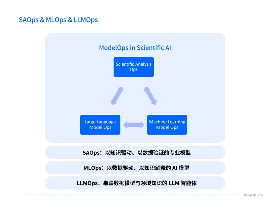 整个空间数据智能场景中,面对海量的数据,不同组织和研究场景之间的协同变得困难。然而,通过高维压缩形成模型,我们能够实现数据的共享和传递。数据的内在信息与价值正日益以更为丰富和高维的形式融入模型中,对数据的生命周期管理已逐渐演进为对模型生命周期的全面掌控,在此基础上,我们需要进一步审视并协调数据生命周期与模型生命周期之间的动态关系(From DataOps to ModelOps)。当前,针对空间数据智能分析场景的模型生命周期管理流程,和鲸通过自身实践,总结出以下 3 种 AI for Science 的ModelOps 方法论。