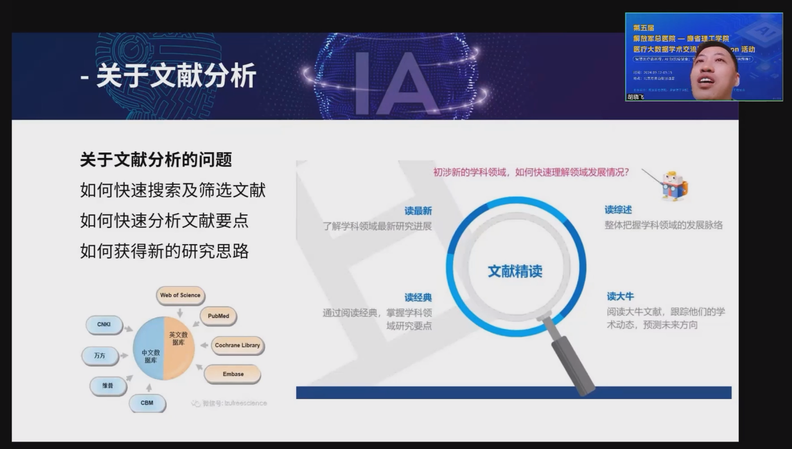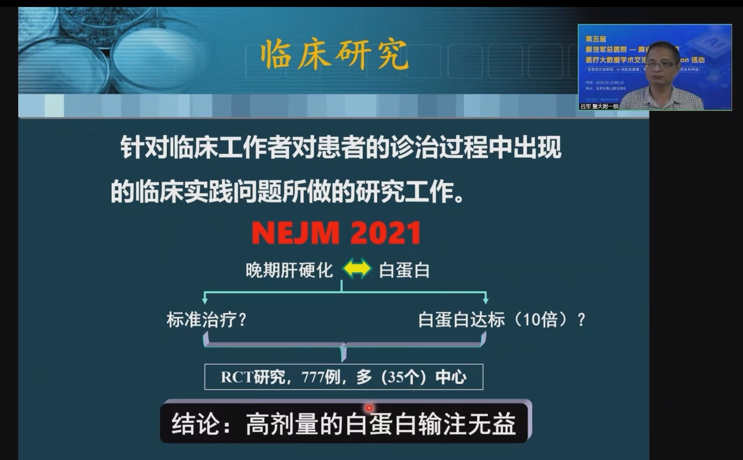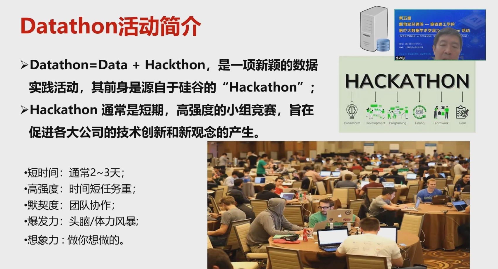 解放军总医院医学创新研究部高级工程师张政波教授首先为参会人员介绍了医疗大数据与跨学科合作 Datathon 活动的主要内容。Datathon 是源自硅谷 Hackathon 的跨学科医疗与数据融合创新实践活动,是短期、高强度的小组竞赛,汇集不同背景参与者,用医疗数据和计算方法在短期内协作解决临床问题和满足医疗需求,最初由 MIT 和哈佛医学院团队发起,解放军总医院率先引入国内。“以人工智能 AI 技术为核心的范式,正开启以人机共融为特征的科学研究新时代,临床领域的很多工作都会基于大模型展开”。张政波表示,Datathon 作为医疗跨学科合作的一大重要契机,可以帮助众多临床领域研究者从数据中学习,建立智能预测与决策模型,指导未来实践。