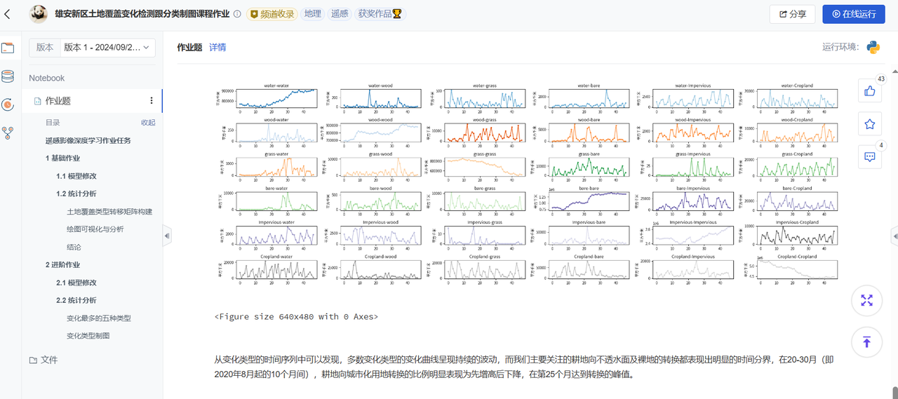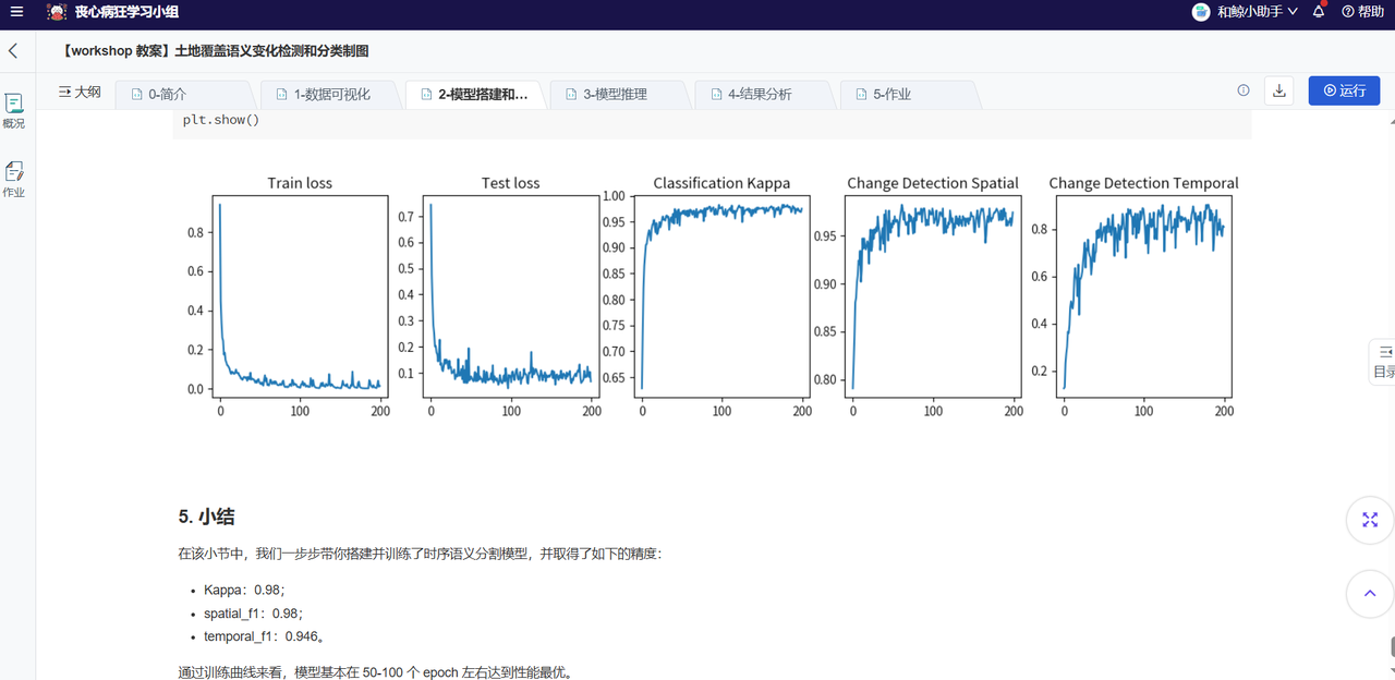 本次 Workshop 课程主要分为四个部分:模型训练:学员深入了解了时序语义分割任务中数据的输入和输出的维度变化,以及如何科学地划分训练集、验证集和测试集,通过实践,学员成功运用 PyTorch 框架搭建并实现了 FCN 全卷积网络模型,为时序语义分割任务奠定了坚实基础。模型推理:在模型训练完成后,学员学习如何组织研究区域的四维数据,并调用已训练好的深度学习模型进行变化信息推理。为确保高效运行,推理结果即时在线存储,有效规避了“内存爆炸”的风险。结果分析和制图:此环节聚焦于推理结果的深度挖掘与可视化表达。学员学习统计与分析技巧,涵盖变化占比、频次及时间分布的绘制,同时掌握土地覆盖分类制图技能,对不同类型的变化占比及趋势进行细致统计,提升数据分析与呈现的专业度。实践作业:课程最后设置了丰富的作业,包括模型修改、统计分析等,旨在帮助学员巩固所学知识,并进一步提升自己的实践能力。