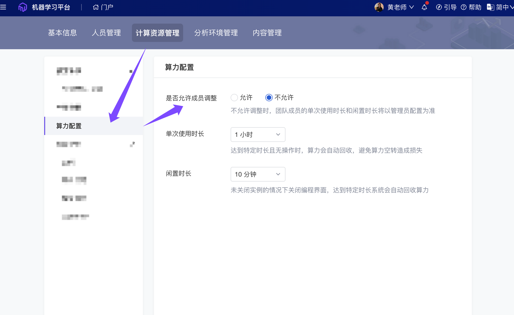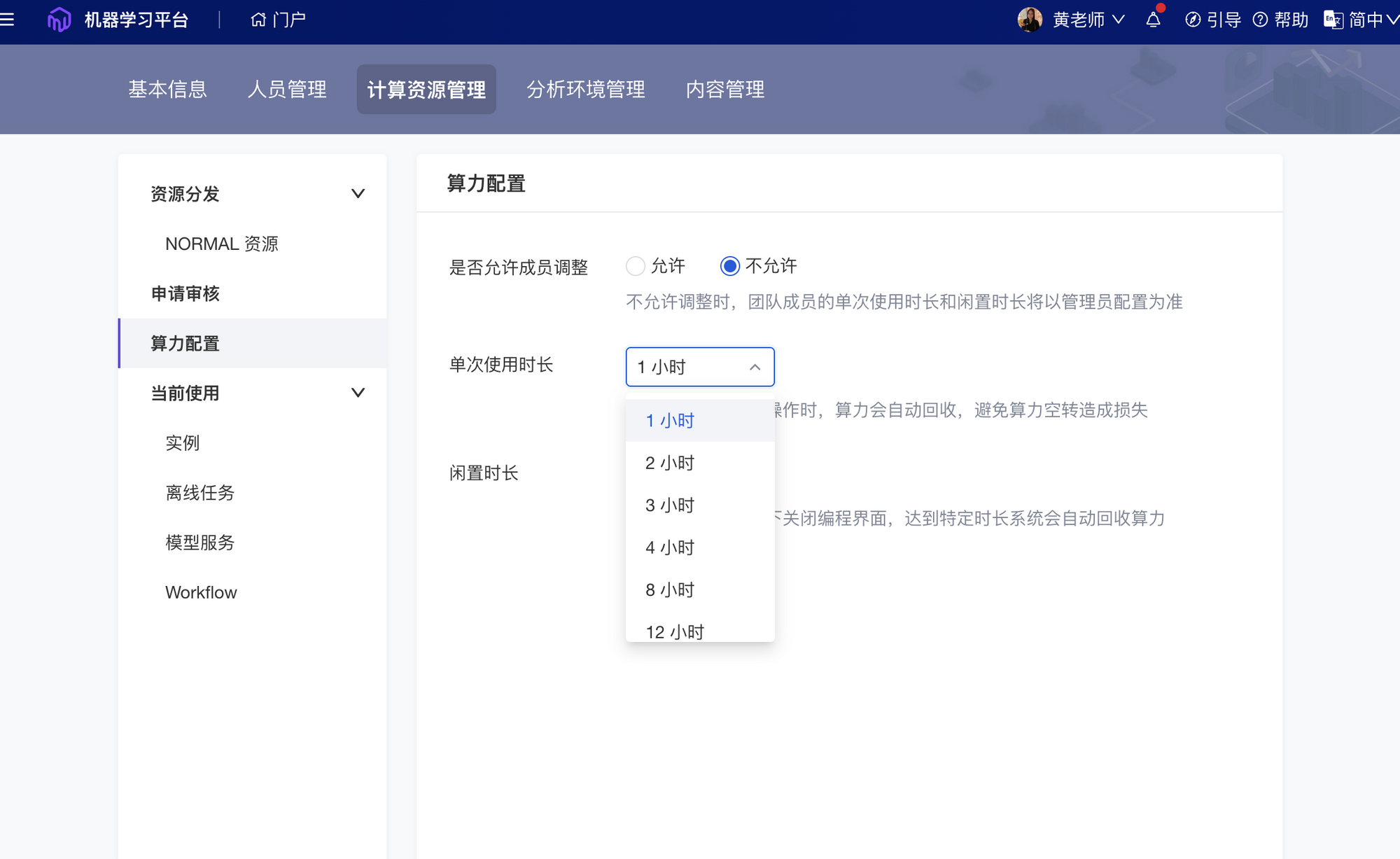 单次使用时长,是用户进入运行时后可持续运行的时间(假设可用时长余额充足)。为避免学生忘记关掉浏览器造成的算力消耗,老师可以将该时长设置为 1 小时。到时间后,平台将自动断开资源连接(如果用户不再手动续时)。