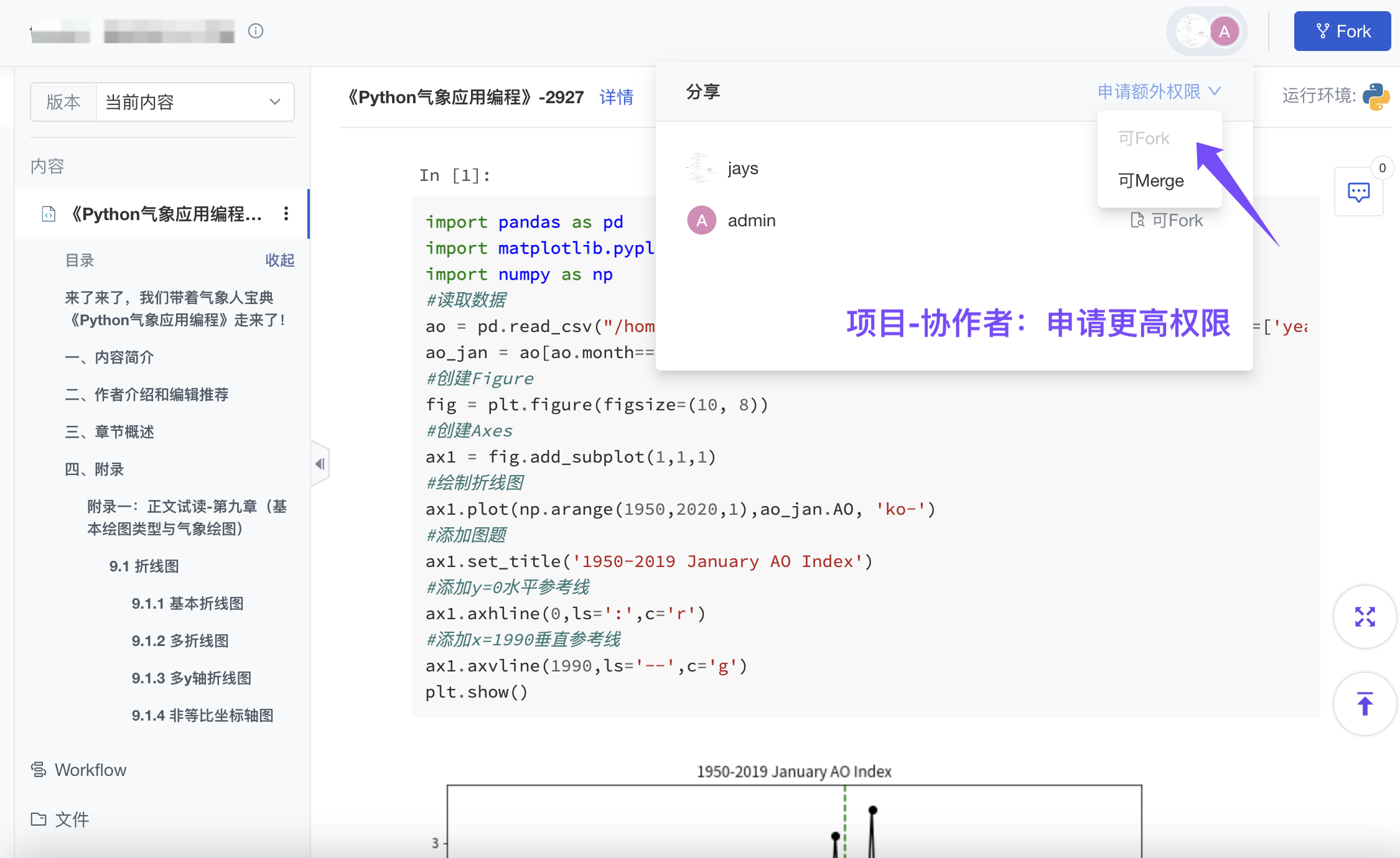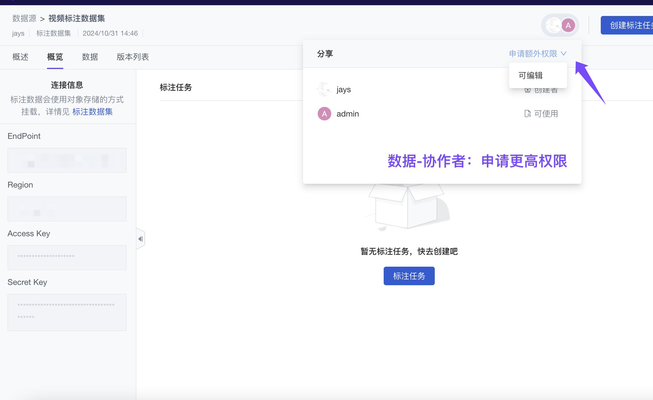项目、数据分享时的最低使用权限分别是【可查看】、【可使用】。如希望获得更高协作权限,用户现可以自行申请。