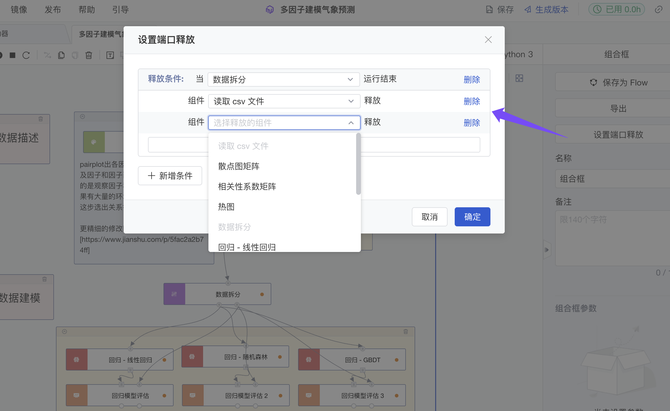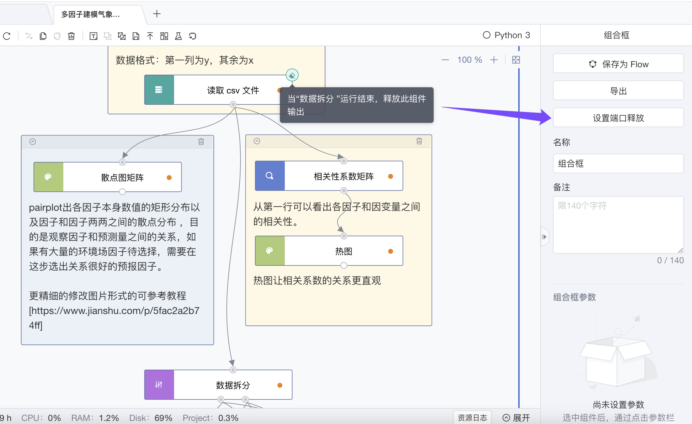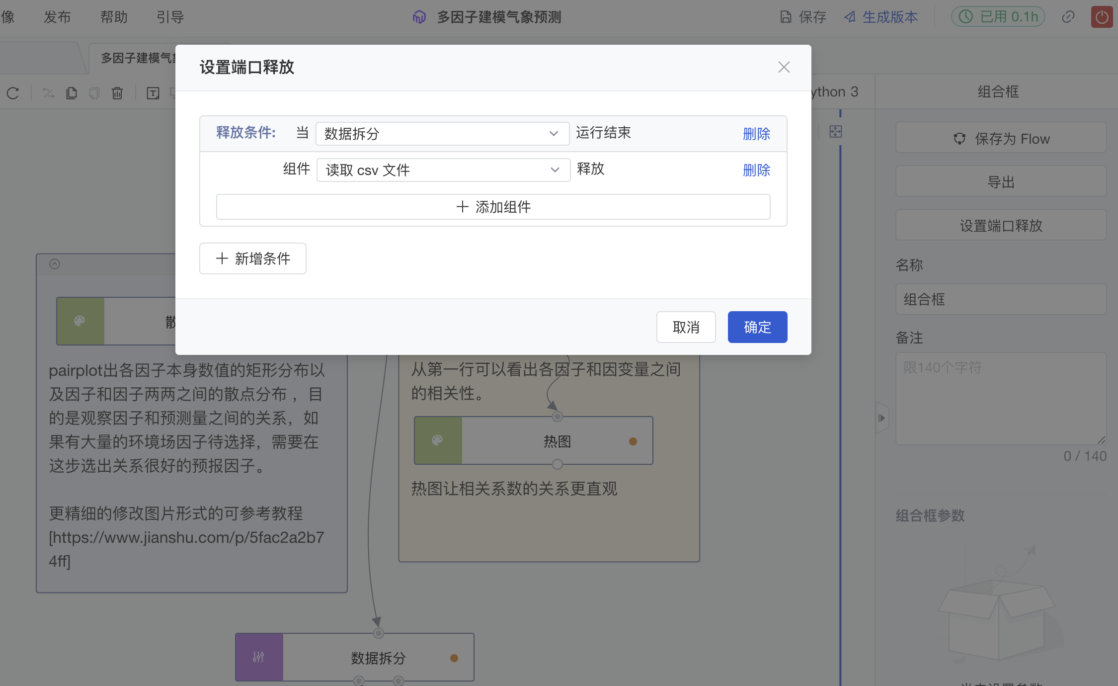 用户可以使用 Canvas 低代码工具分析业务数据。当 Canvas Flow 工作流中涉及较多组件、处理的数据量大、处理步骤多时,可能会造成内存溢出造成使用问题。因此,我们设计了“端口释放”功能:你可以设置“当「组件 A」运行结束后,释放「组件 B」的输出”,以达到内存及时释放的目的。示例 Flow 中用户正在进行数据分析、其中输入数据比较大,因此设置了“当「数据拆分」运行结束后,释放「读取 csv 文件」组件的结果输出”。