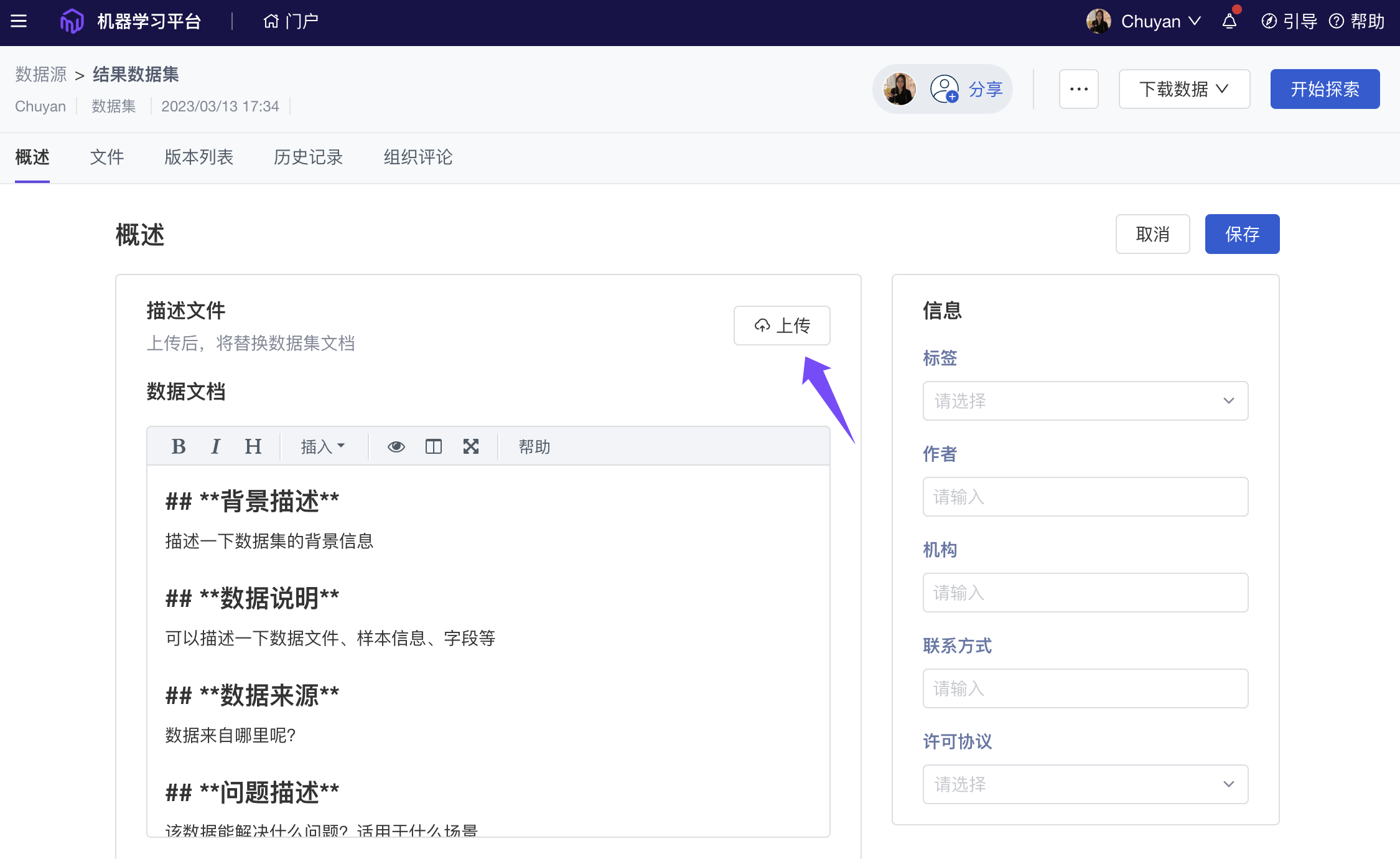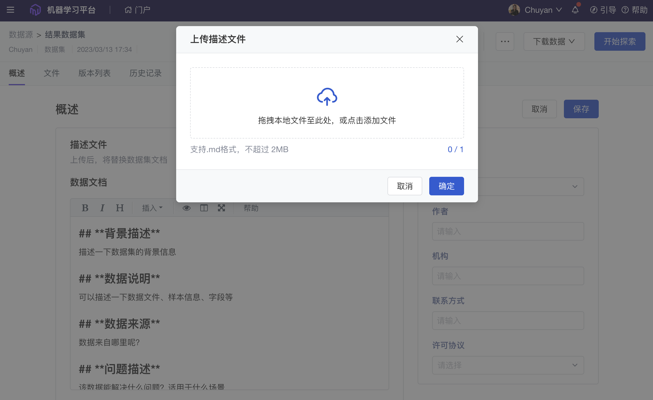 ModelWhale 元数据系统支持以 FAIR 原则进行数据治理。人工逐个配置数据的元数据字段是繁琐的,平台现已支持自动解析数据描述文档(YAML 格式)为元数据,大大降低人工操作成本。