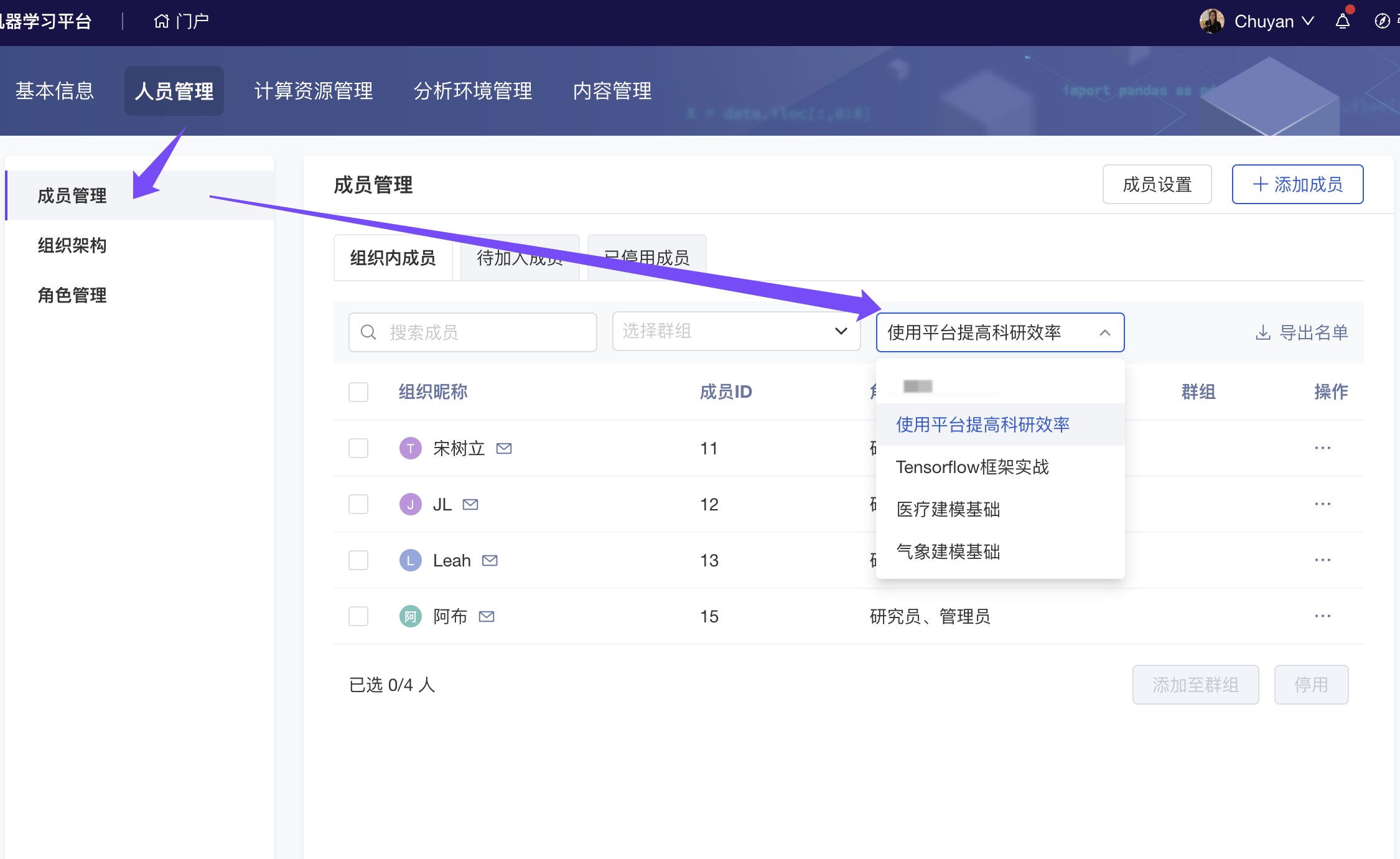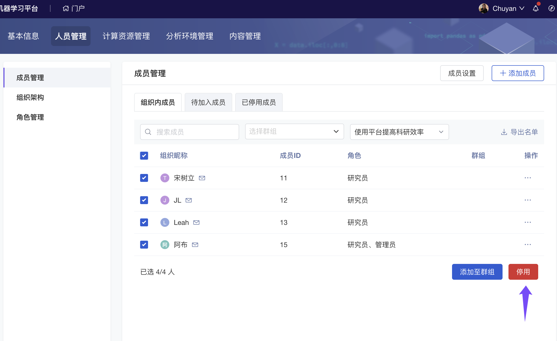 课程结束后,老师可以将历史学生账号批量停用、移出组织,释放组织席位。