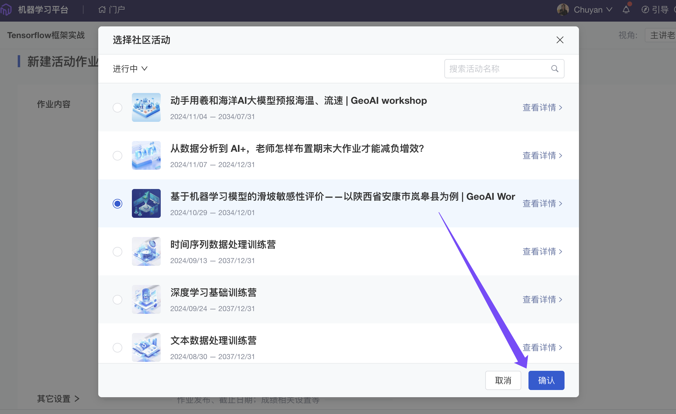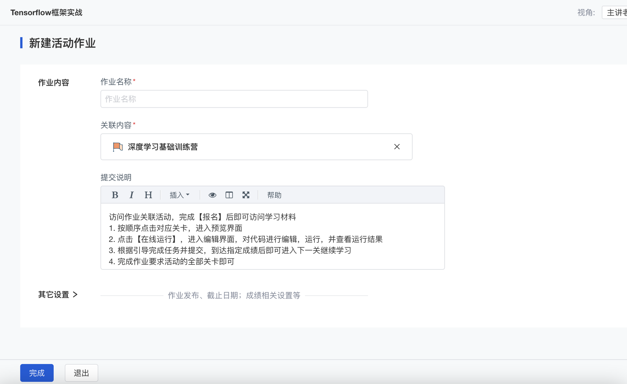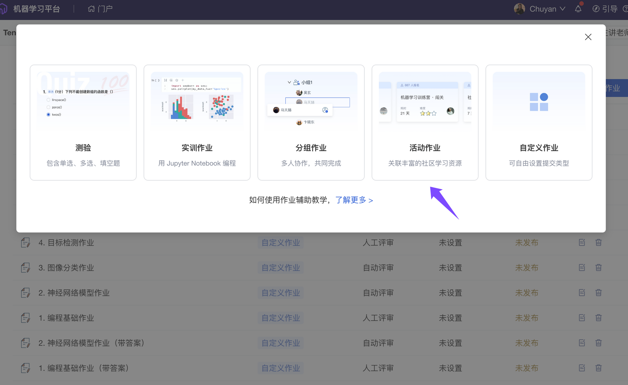 和鲸社区拥有丰富的教学实训资源,老师在 ModelWhale 平台开展课程教学时,可以选择这些社区资源作为课程作业布置给学生完成。这些社区活动配有完整评审系统,支持自动为学生出分;自此,老师无需再花时间用于设计作业细节、批改作业的事情上,大大降低教学负担。