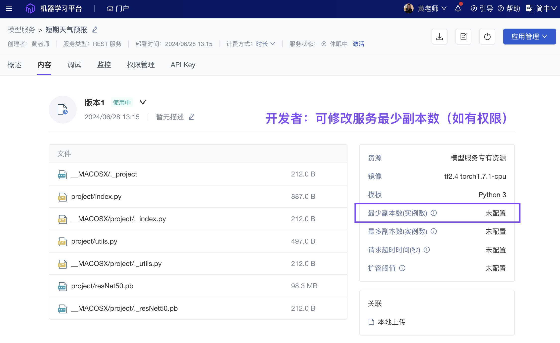 (2)模型服务,新增“最少副本数”设置的权限控制