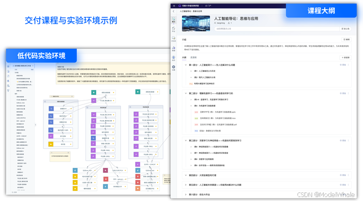 - 和鲸ModelWhale教学实训平台涵盖即开即用的编程分析环境、Canvas 低代码拖拉拽组件、课程管理模块(含课件管理、作业管理、题库、论坛、学情统计等)、算力管理、镜像(环境)管理等模块;
