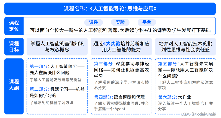 - 提供完整的 AI 通识课程材料,包括课程大纲、PPT、讲课视频、实验作业、实验环境等;
