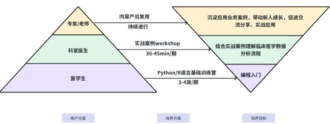 医学生的理论知识较为扎实但实践经验相对匮乏,对此医院将开展基础技能类训练营,如“Python 基础”“R基础”“医学数据分析基础”等,以提升其数据分析、编程能力。