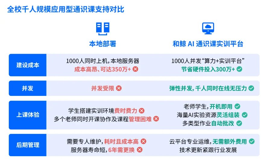 在教学场景的选择上,学校是否应全面拥抱云端平台,还是适度结合本地部署,核心考量在于学校的实际需求与预算条件。对于涉及大量学生的通识课程,特别是实验类课程,云端平台通常是更优选项。本地实验室在应对大规模学生群体时可能力不从心,而云端平台则能轻松承载。和鲸已成功助力某高校人工智能通识课程全校覆盖,超过6000 名学生在云端学习。